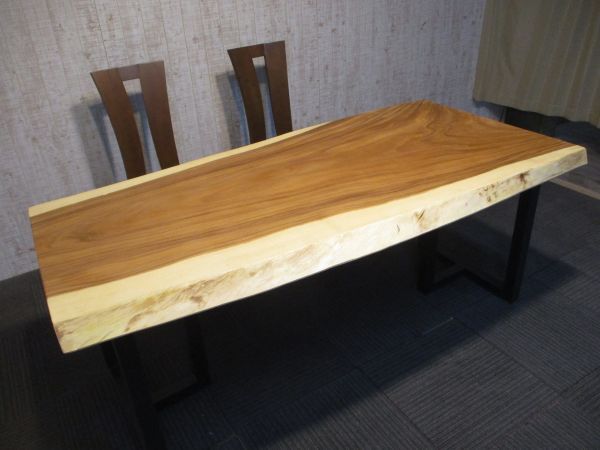 モンキーポッドの一枚板無垢のテーブルです。幅広サイズです。杢の模様が魅力です。両面ご使用になれます。この幅広サイズが人気です。