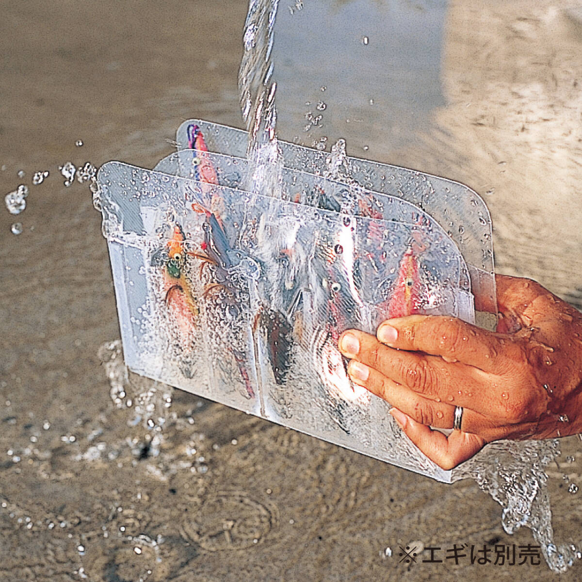プラ製ラックは簡単に取り外せ、エギを入れたまま丸洗いOK。