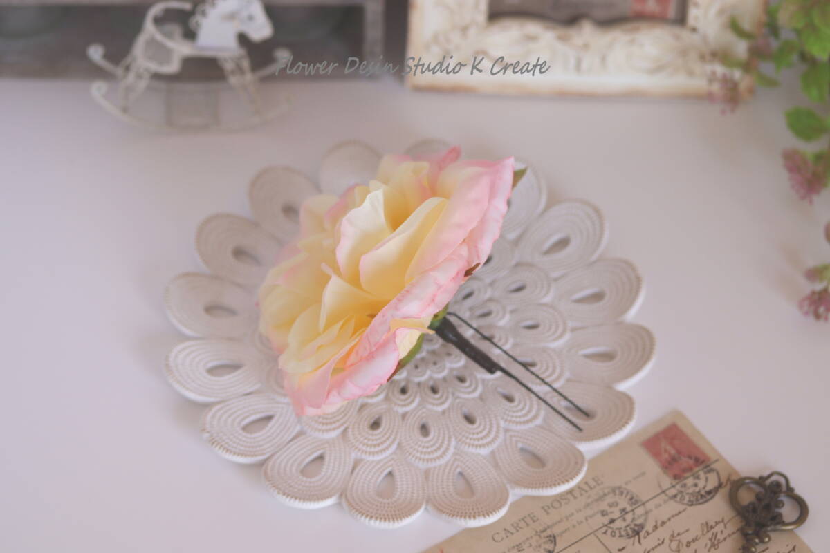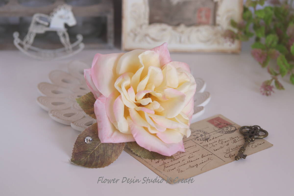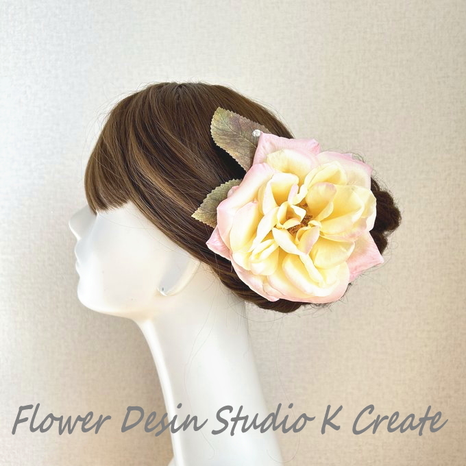 | とても軽い造りの、エアリーな、 クリームピンクの薔薇のフローレスです。 大きさは14cmの薔薇で、 存在感があります。 リアルな葉っぱには、朝露の様に、 ライトストーンを一粒おつけしました。 お花と一体で、 ワイヤーで添えているので、 角度の調整もできます。 フラメンコなどのダンス、 ピアノの発表会など、 クリーム、ピンク系の御衣裳に、 ワンポイントの髪飾りとしてお使い頂くと、 センスのあるフローレスになると思います。 薔薇のUピンは、 長さ72mmのUピンを使用しています。 長めのUピンですので、落下しない様、 深く挿す事が出来ます。 シニョンやアップスタイルなどに、 サロンで最も使われる、日本製のUピンです。 滑り止め加工を施しているので、抜けにくく、 ロングサイズのUピンですので、 細い毛質の方や、 髪の多いシニョン(モーニョ)にもしっかりと留まります。 ダンスの時に、回転した遠心力で、 お花の髪飾りが飛んでいくハプニングが無い様、 お花のバランスを考え、 深く挿さる長めのUピンを使用しています。 【サイズ】 全体:140mmx190mm前後 1本 花径:140mm 生花に限りなく近い色彩と質感にこだわってセレクトしています。 ●K CreateのUピンは、フローラテープが剥がれない様、 コーティング処理を施しています。 #結婚式 #ブライダル #ウェディング #前撮り #謝恩会 #クリームピンク #二次会 #ヘッドドレス #頭飾り #卒業式 #成人式 #パーティー #ヘッドアクセ #振袖 #発表会 #ピンクの薔薇 #卒業式 #薔薇の髪飾り #フラメンコの髪飾り #和装 #和装髪飾り #造花 #髪飾り #ピンク #バレエ #ヘッドピース #レッド #薔薇 #発表会 #舞台 #コンクール #フラメンコ #フローレス #ダンス髪飾り #薔薇 #ピンクのバラ 【ご注意】 作品画像、作品の模倣コピー、内容、デザイン全般の無断転載・転用、 アイデアの盗用は、お断り致します。 | ||