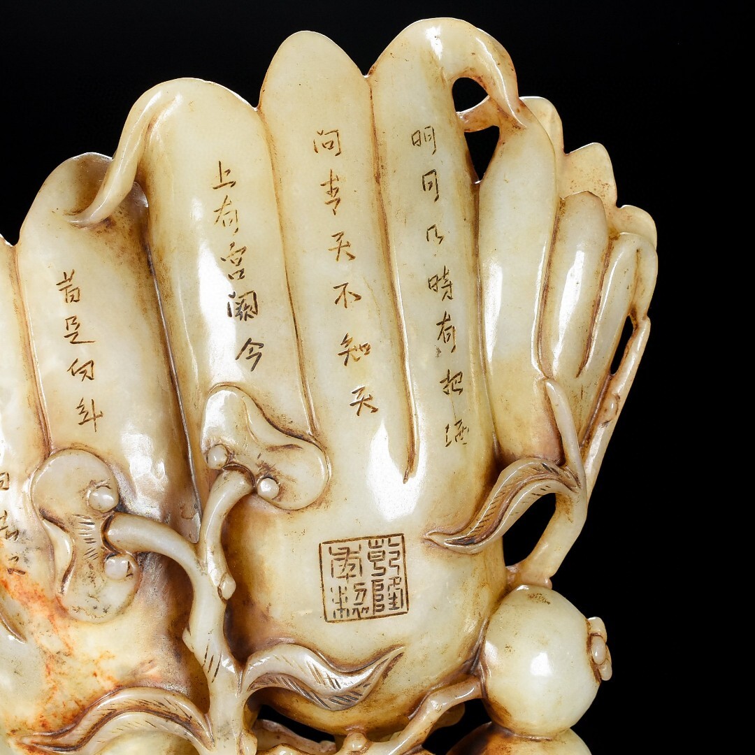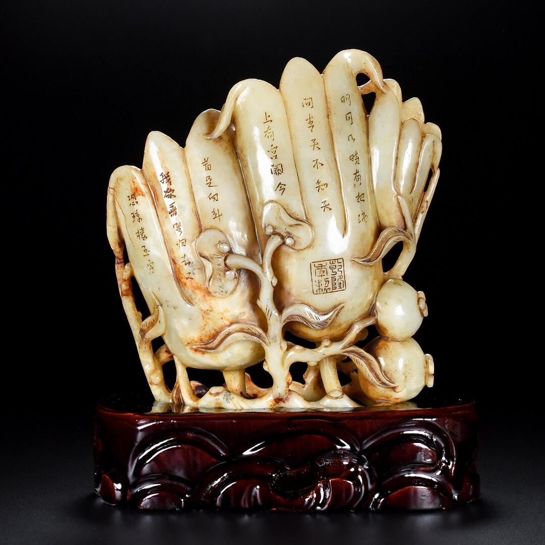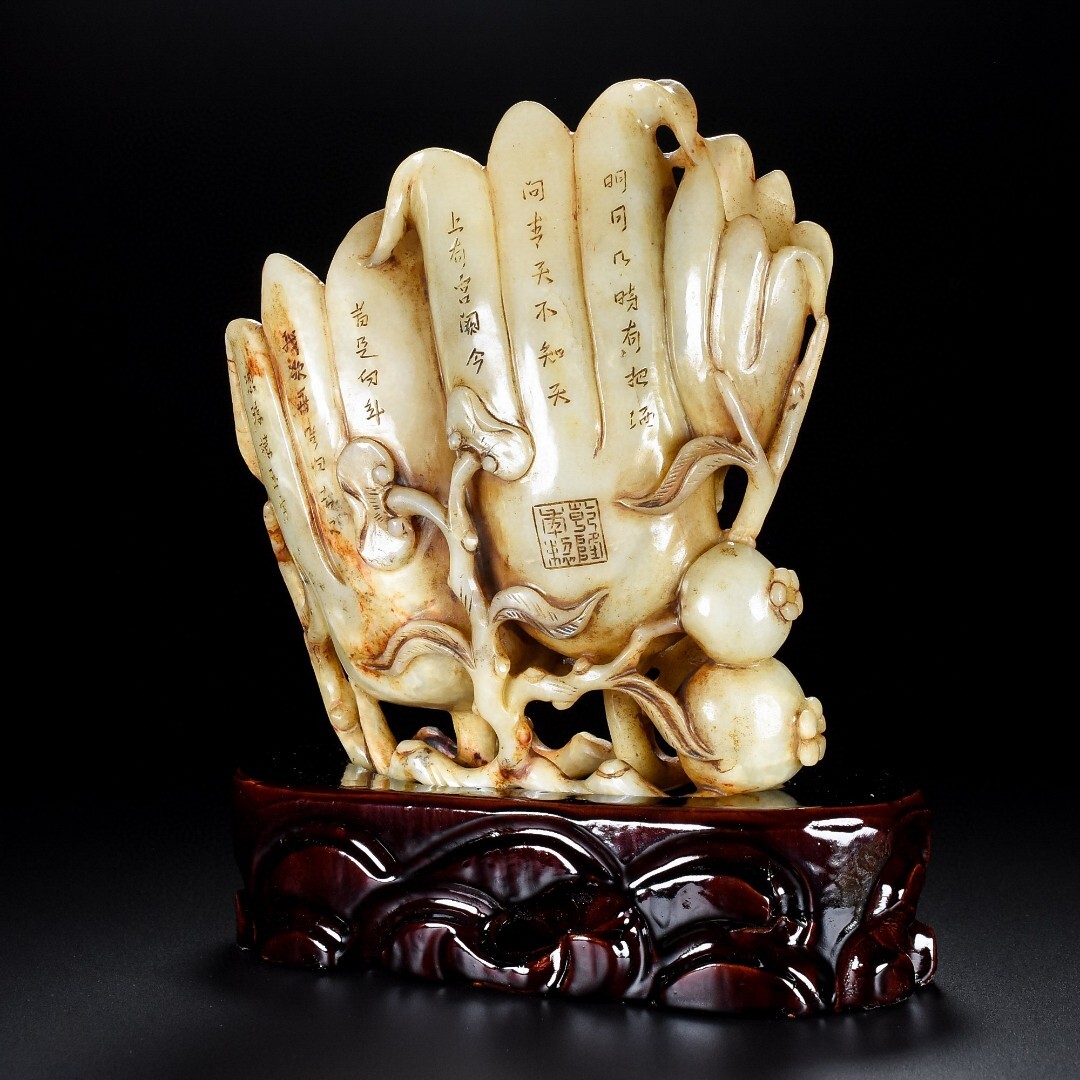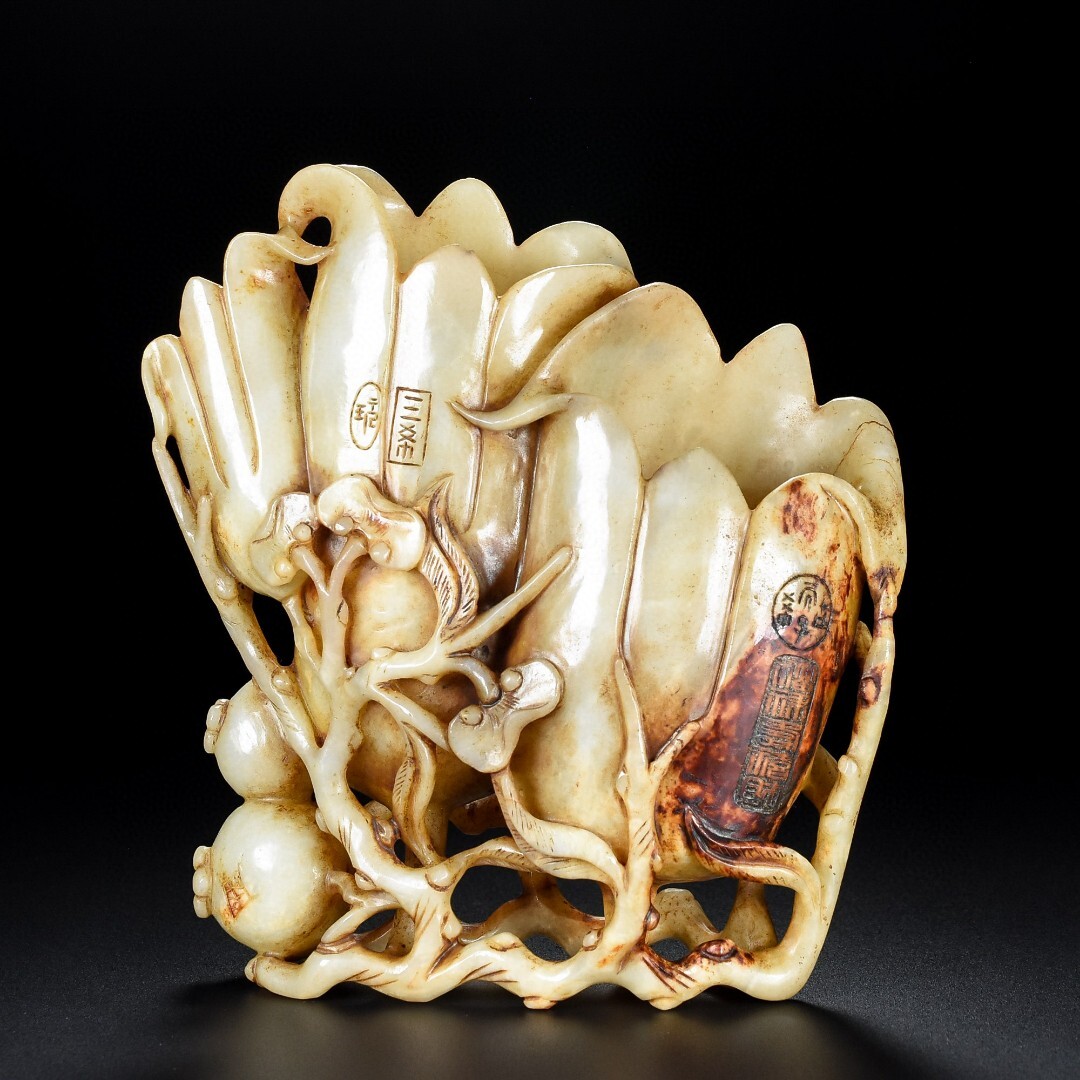 旧蔵 清 乾隆年製 玉彫 和田老玉 花插 筆筒 筆道具 極細工 中国古玩 古美術 骨董品 202-13