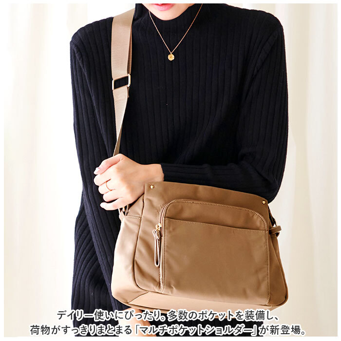 商品説明 | ・・デイリー使いにぴったり。多数のポケットを装備し、荷物がすっきりまとまる「マルチポケットショルダー」が新登場。 ・【落ち着きのあるデザイン】 ・サラッとした質感で程よい光沢感のあるナイロン素材を使用。部分的にフェイクレザーやゴールド金具を取り入れ、カジュアルすぎない仕上がりに。 ・【ちょうどいいサイズ感】 ・小さすぎず大きすぎない!お出かけのマストアイテムをひとまとめにしつつ、満員電車などの人混みでも邪魔にならないマチ設計。 ・【ダブルファスナー開口】 ・開口部は左右どちらからも開閉できる、ダブルファスナー式。ガバっと開いて中身が見渡しやすく、出し入れがラクラク。 ・【A5サイズ対応】 ・内側はA5サイズのノートが横向きにすっぽり。長財布やペットボトルなども収納でき、使い勝手ばっちり。 ・【充実の10ポケット仕様】 ・内側・外側合わせて10個のポケットを装備。小物が迷子になりにくく、必要な時にすぐに取り出しOK。 ・【使い心地軽やか】 ・サッと持ち出せる軽量なつくり。体に負担がかかりにくく、長時間の移動もストレスフリー。 ・【持ち方をアレンジ】 ・ショルダーの長さを調節して、肩掛けも斜め掛けもお好みで。ショルダーは肩に食い込みにくい幅広仕様。 ・【ちょっとの雨なら大丈夫】 ・表面に水滴や汚れを弾く撥水加工済みで、お手入れも拭き取るだけ。(※完全防水ではありません。) ・【選べるカラー】 ・コーデを選ばず使いやすいカラーをラインナップ。シーズン問わず、ヘビロテ間違いなし♪ ・【ポケット仕様】 ・内側:ファスナーポケット×2、オープンポケット×3 ・前面:マグネットポケット×1、ファスナーポケット×1、オープンポケット×1 ・背面:マグネットポケット×1、ファスナーポケット×1 |