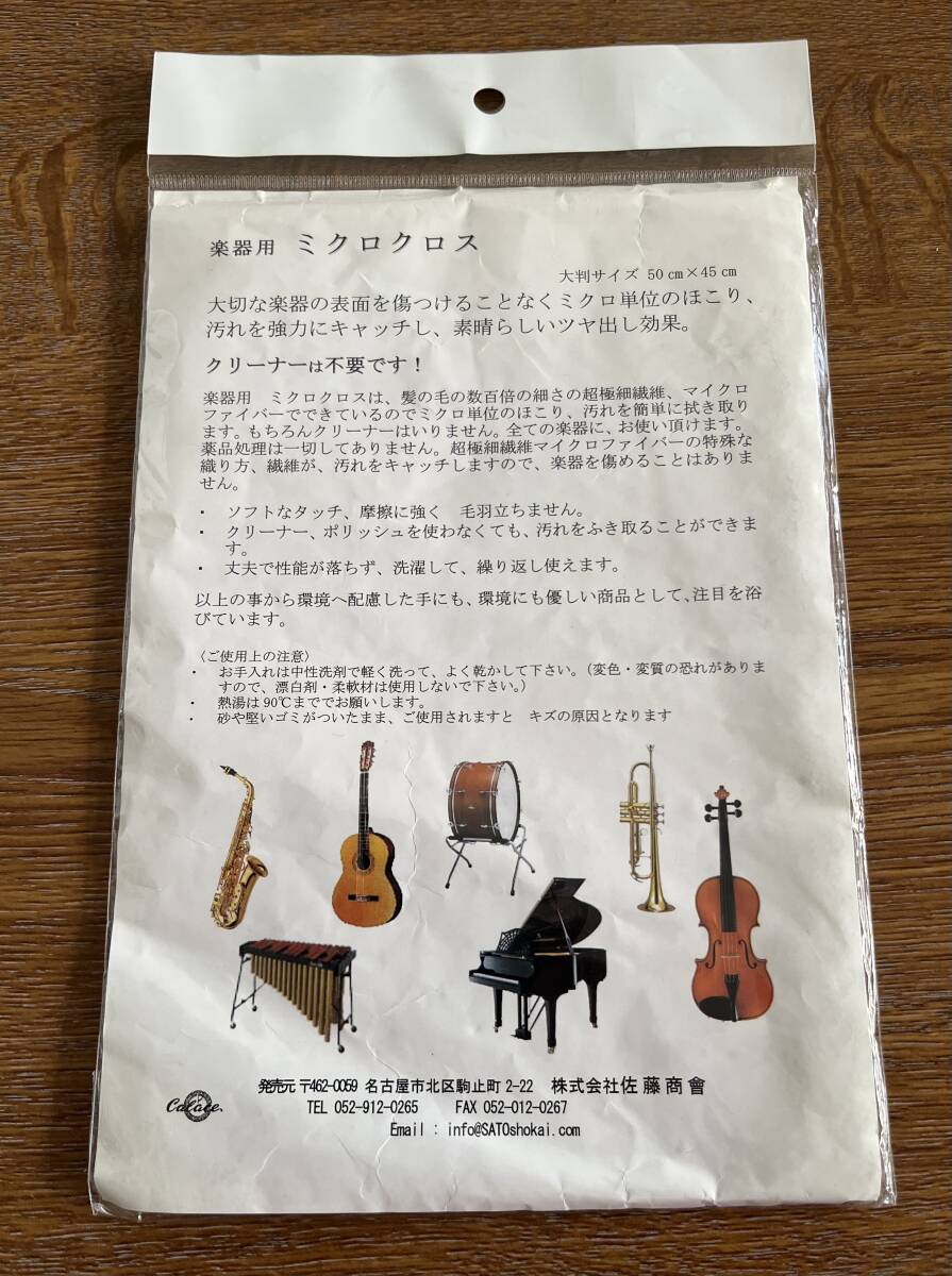 【商品内容】 楽器用ミクロクロス(グレー) (株)佐藤商会製です。大切な楽器の表面を傷付けることなくミクロ単位のほこり、汚れを強力にキャッチし、素晴らしい艶出し効果があります。使用せず自宅保管しておりました。 【サイズ】縦 : 約50㎝、横 : 約45㎝ Micro Cloth for Musical Instruments (Gray) Made by Sato Shokai Co., Ltd. It powerfully captures microscopic dust and dirt without damaging the surface of your precious musical instrument, and has a wonderful polishing effect. ※詳細は写真をご覧いただき宜しくお願い致します。 ※送料は定形外郵便またはゆうパック(60サイズ)で、出来るだけ安価となるよう梱包しお知らせいたします。