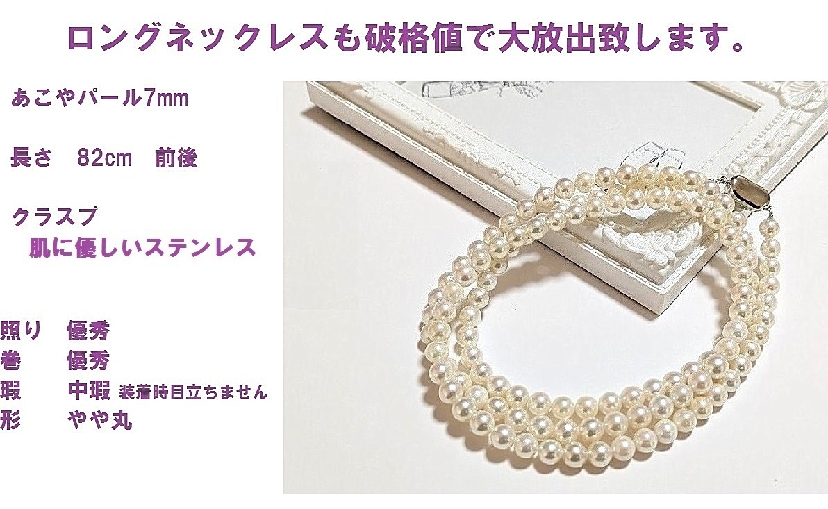 商品説明 | 真珠の街神戸から お買い得限定セール 今回特別に8mm~8.5mm前後のロングネックレスです 【真珠の種類】 あこやパール 『参考価格』販売店により異なります 【真珠のサイズ】 8mm~8.5mm クラスプはプッシュ式です。 肌に優しいステンレス製(変色防止処理) きちんと装着して出来立てのお品を発送致します。 【色】 ホワイト系ややピンク 真珠の評価 *** 巻き・・・ 最高に良い 光沢・・・ 最高に良い 瑕 ・・・ 中瑕程度有 形 ・・・ ラウンド 【全長】 約 82cm 前後 クラスプも含む キズが付かない様に真珠専用べっちんケースでお送り致します | ||