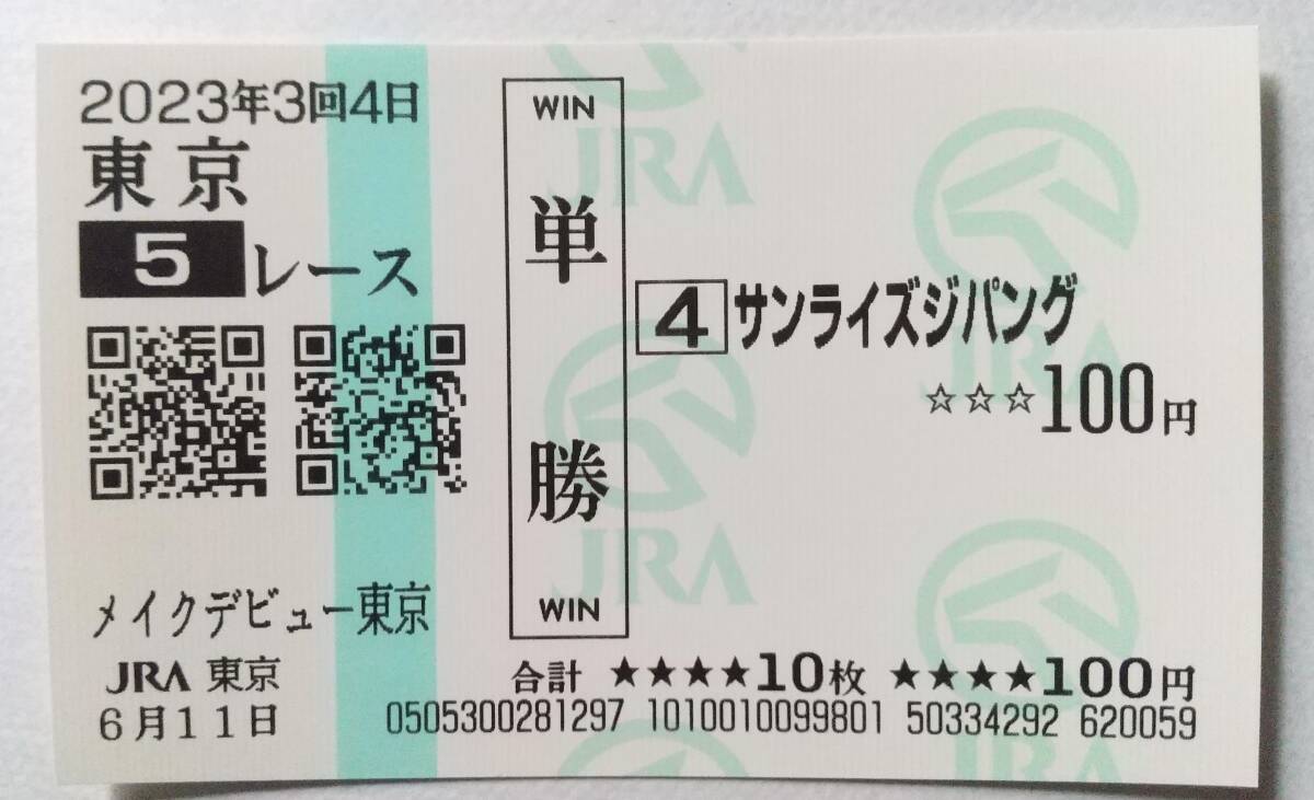 新馬戦、サンライズジパングの現地単勝馬券(額面100円)です。送料として普通郵便110円のご負担をお願いします。郵送事故等の責任は負いかねます。ノークレーム、ノーリターンでお願いします。