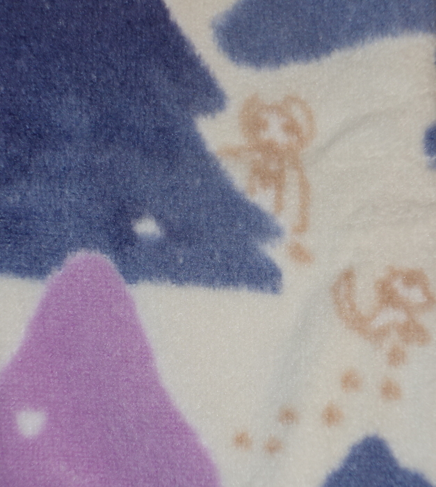 モミの木を明るめの淡い色合いでカラフルに表現した総柄で、森の中にはネコズキンの姿も見られます。