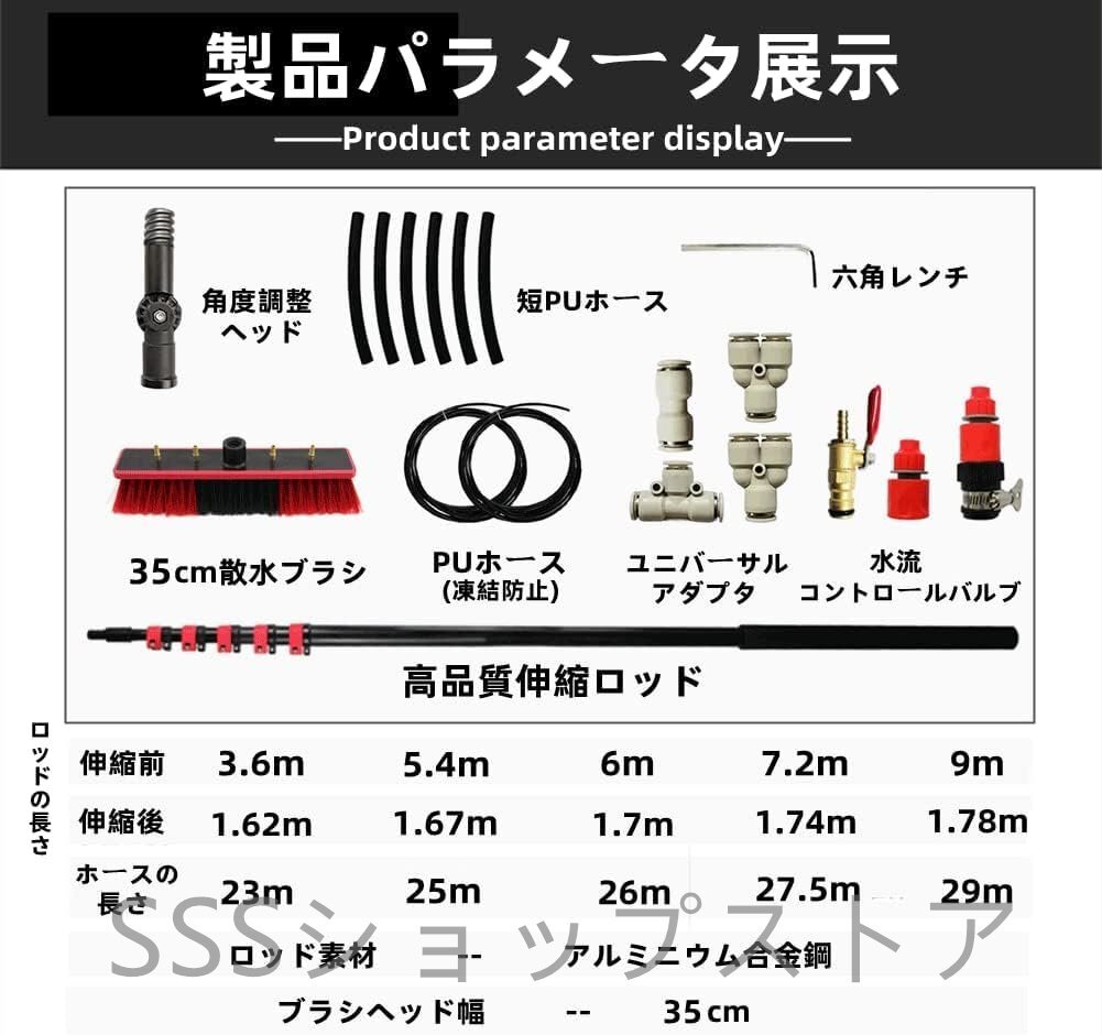 【商品のサイズ】:名称:高所掃除用ブラシ 外壁掃除ブラシ。ロッド長さ範囲:3.6-9m。散水ブラシの幅:35cm。品質保証:本製品につきましてご不明点やご質問がございましたらご連絡を頂けると迅速に対応致します。