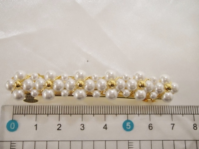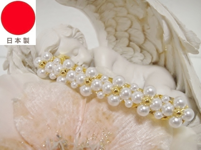♪ 新品 バレッタ 日本製『高品質/ミディアムサイズ/レクタングル/6連フラワー/花/GOLDボール&パール』♪