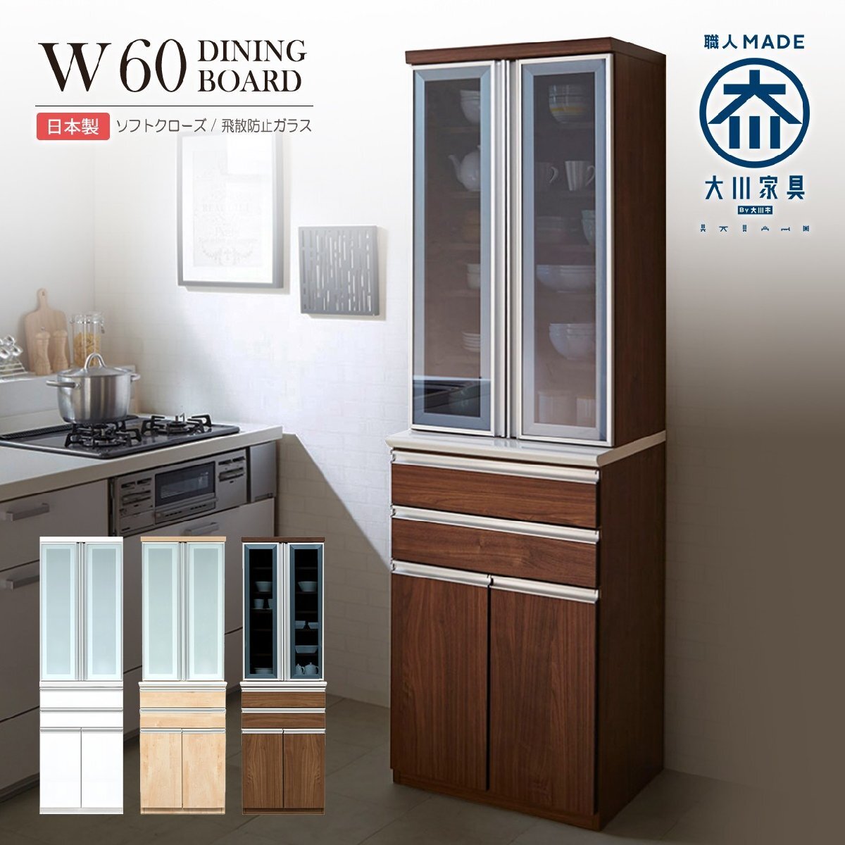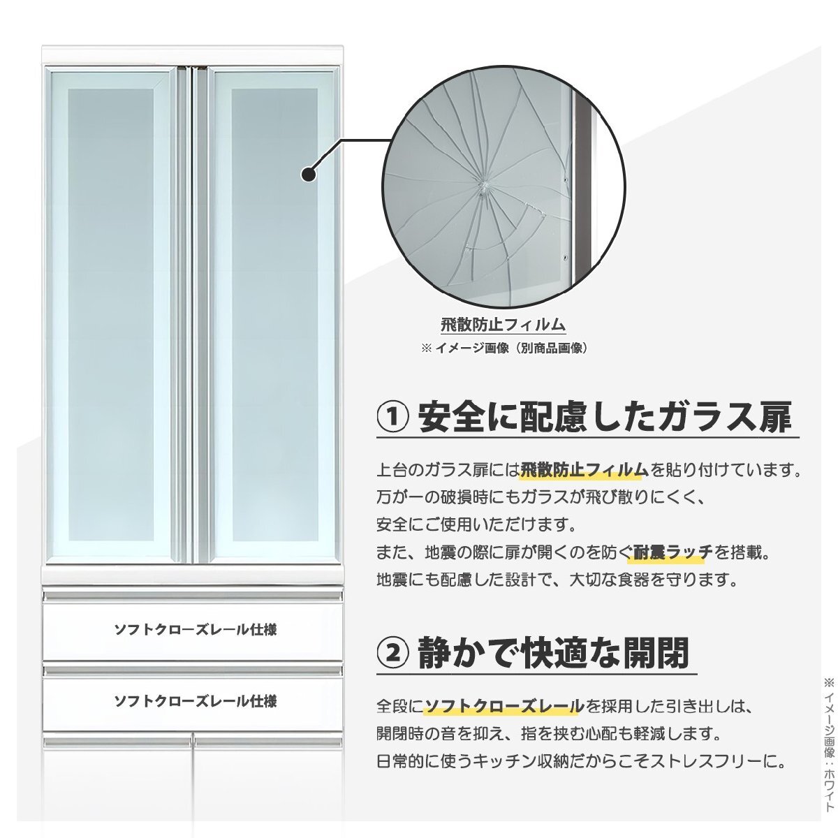 キッチンボード 食器棚 幅 収納 60cm 完成品 引き出し ソフトクローズ アルミ引手 モダン 飛散防止 ホワイト