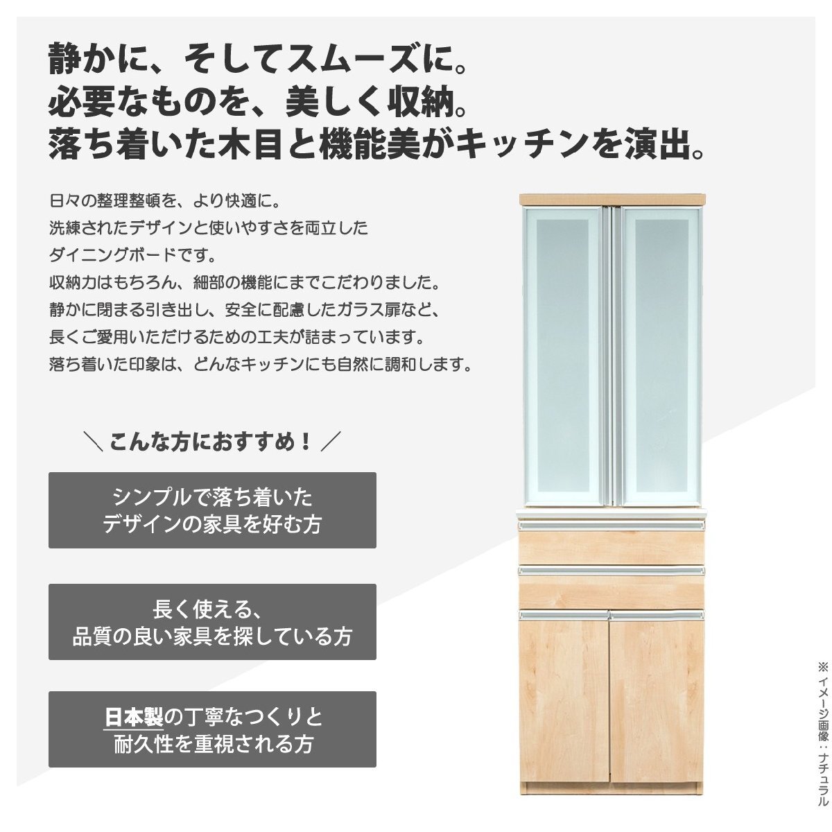静かに閉まるソフトクローズレールの引き出しに、安全に配慮した飛散防止フィルム貼りのガラス扉など、長くご愛用いただけるための工夫が詰まっています。
