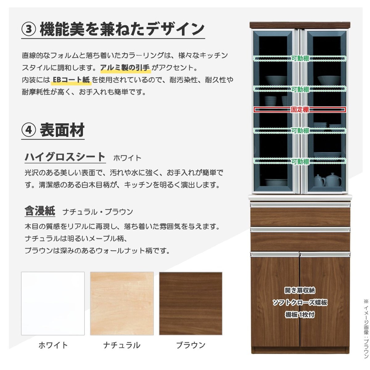 説明マーク●国産 ●完成品 ●上下ジョイント ●MDF ●ハイグロス ●メラミン ●ガラス