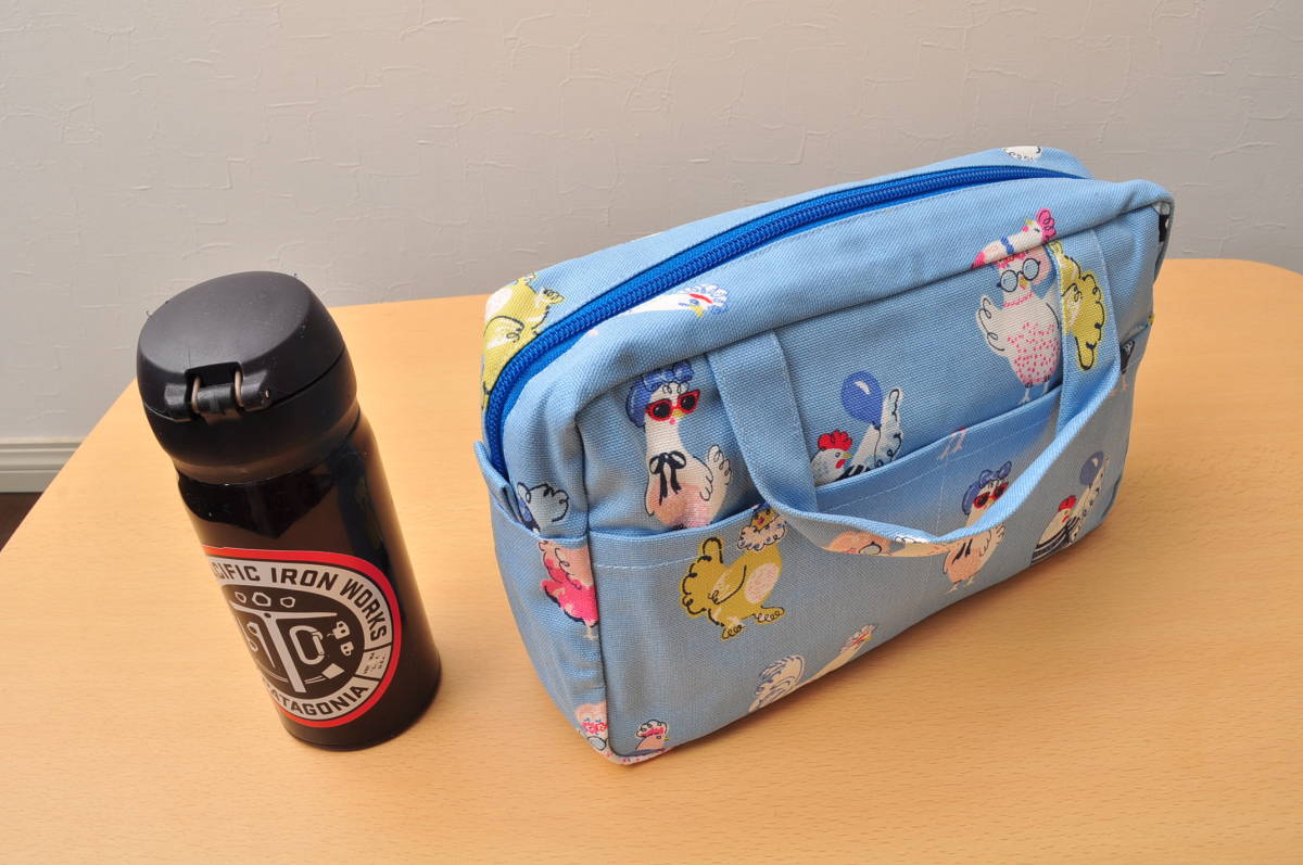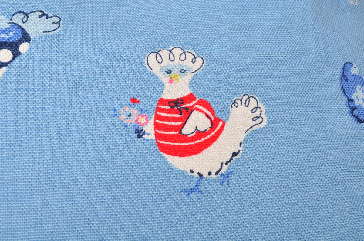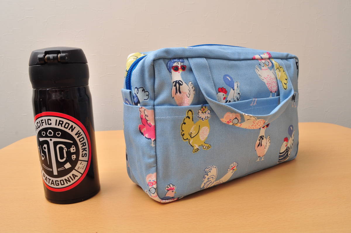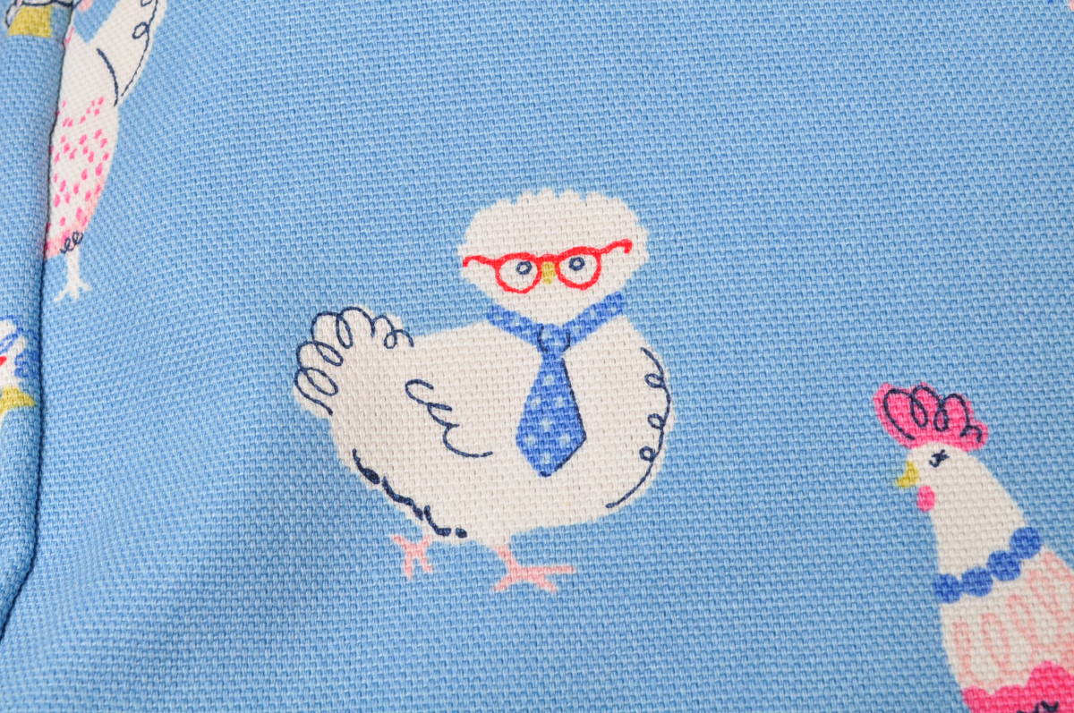 Cornflower柄 の厚手生地(オイルクロスではありません)を外側に、キャスロンドン街並み柄のコットン生地を内側にあしらって、作りました。オイルクロスではありませんので軽く独特の温かみをお楽しみください。もっと作って欲しい~というお声にお答えして再度作りました♪今回は写真でも分かっていただけるかと思いますが、外側にもポケットを付けていますので、デスクの上に置いて、ペンたてやアイフォン入れにも♪