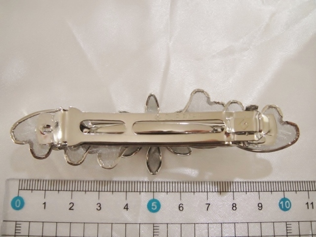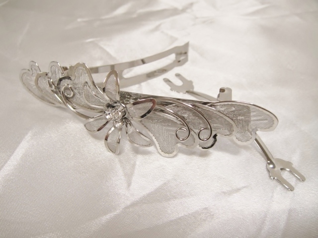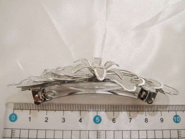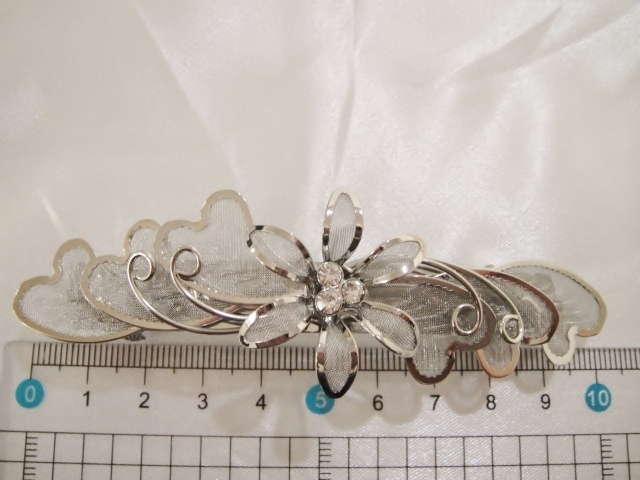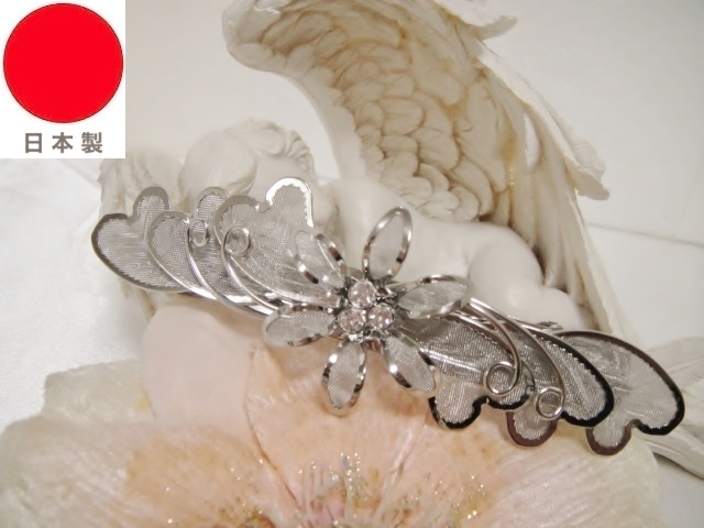 ♪ 新品 バレッタ 日本製『高品質/ロングサイズ/特大3Dフラワー/花/メッシュ/スワロフスキー/silver』♪
