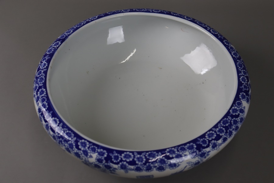 中国美術 景徳鎮製 染付 水鉢 幅41cm 金魚鉢 水盤 細密細工 古美術品[d346]
