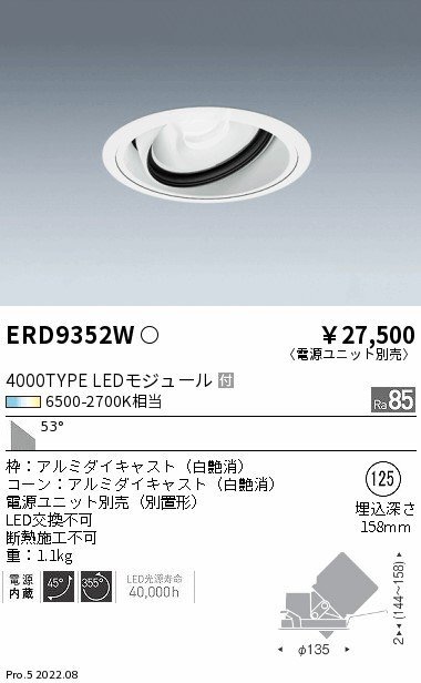 ▽4台セット 遠藤照明 ERD9352W ユニバーサルダウンライト Φ125 無線調光・調色 昼光色~電球色 広角配光 電源ユニット別売 ※特注品