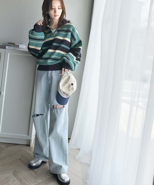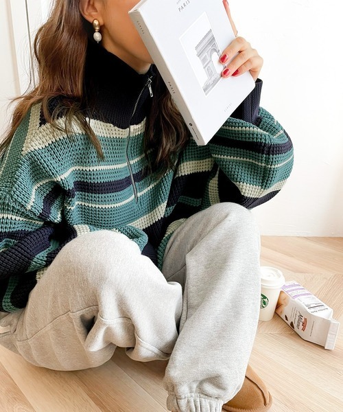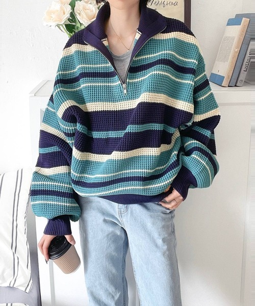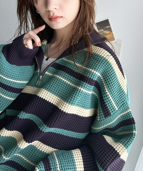 ・商品名:《JaVaジャバ コラボ》レトロ可愛い。マルチボーダー軽量ワッフルハーフジップオーバーサイズニット