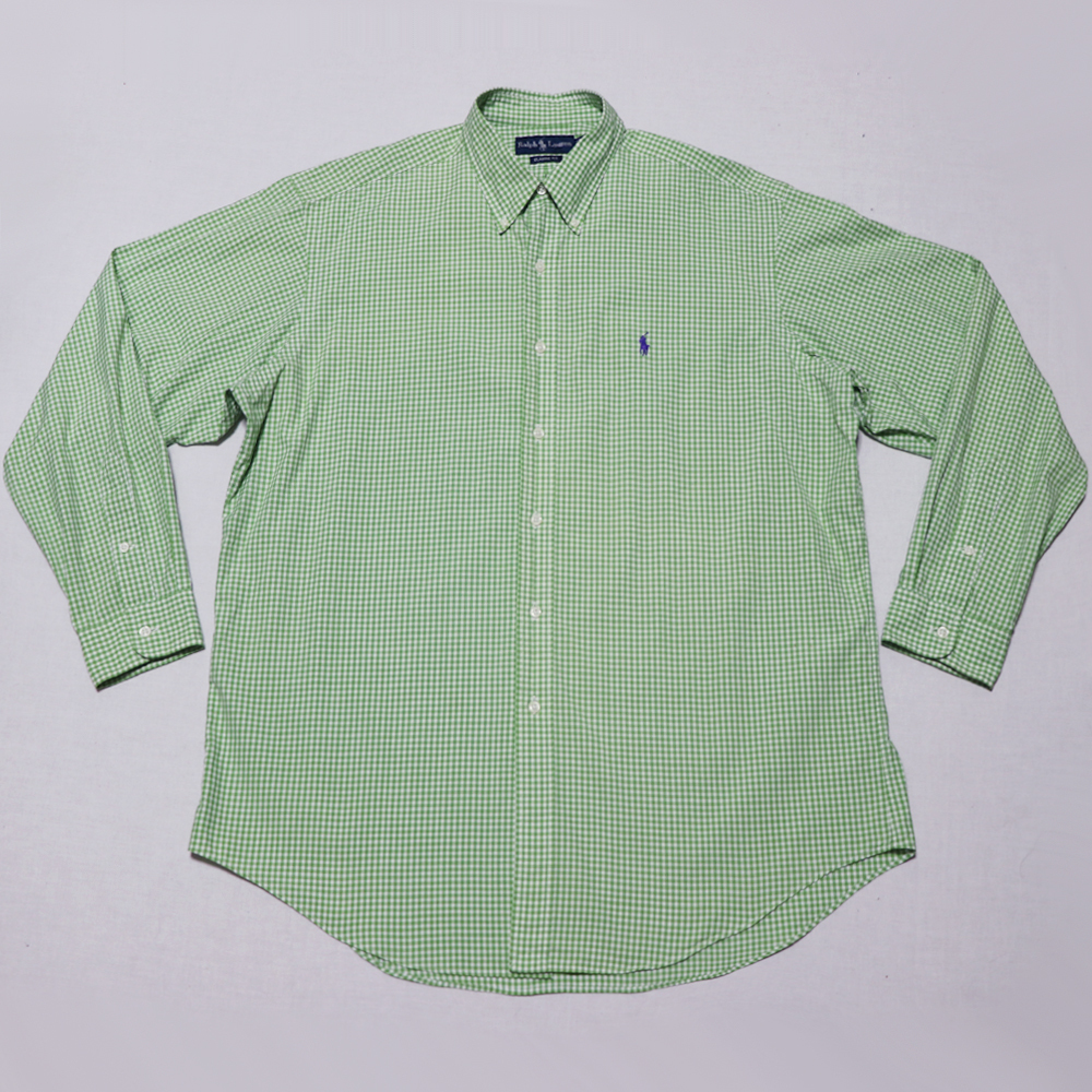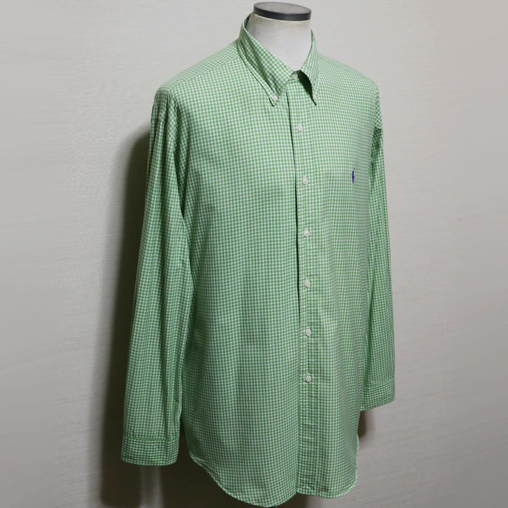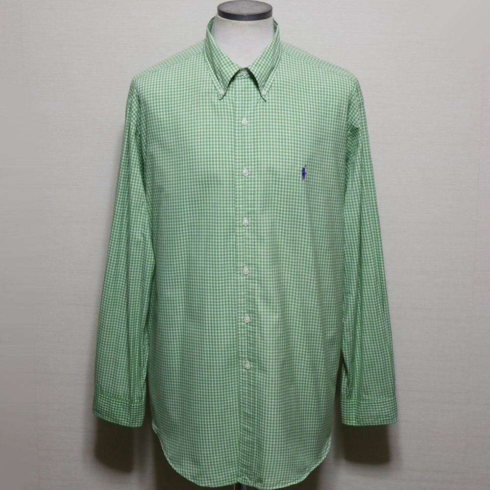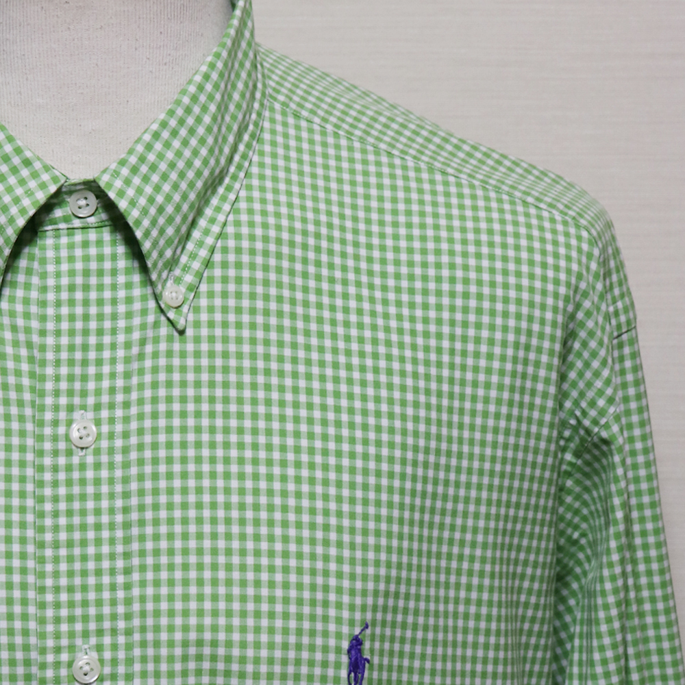 アメリカ購入 美品 ビックサイズ POLO RALPH LAUREN ポロ ラルフローレン ボタンダウン シャツ 黄緑×白 ギンガム 紫ポニーXL サイズです。