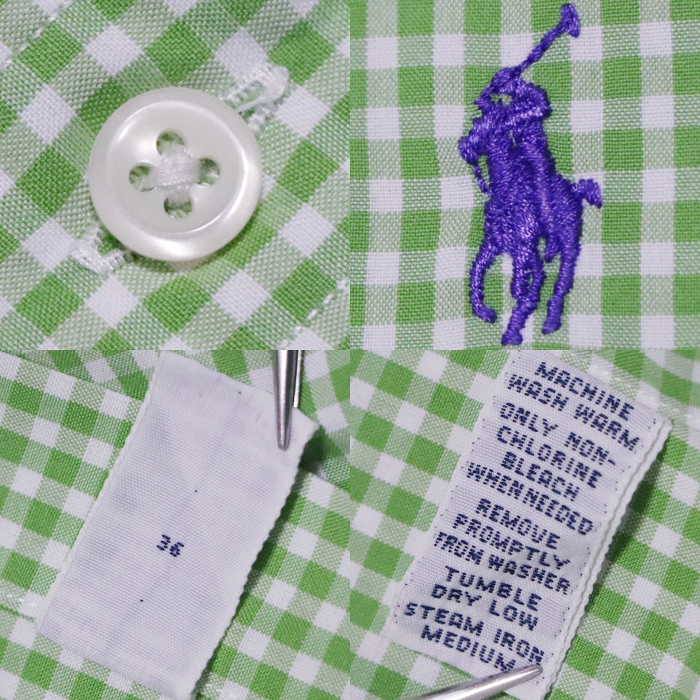 ラルフ定番の美しいシルエットのボタンダウンシャツ。黄緑×白色のギンガムチェックのブロード生地に、紫色ポニーの組み合わせが爽やかでおしゃれです。