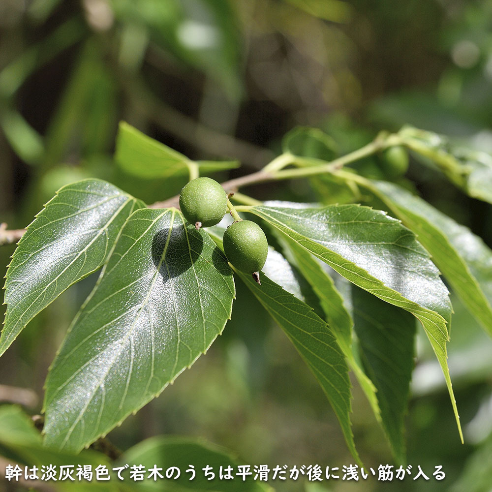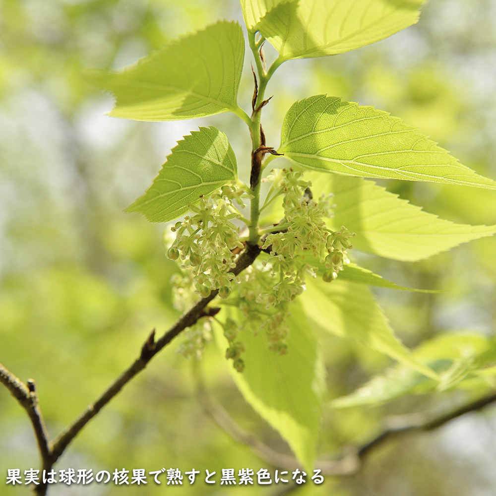 ムクノキは街路樹や山林用として利用されます。剛健で育て安い品種です。黒紫色の実は干し柿のような味がして美味です。