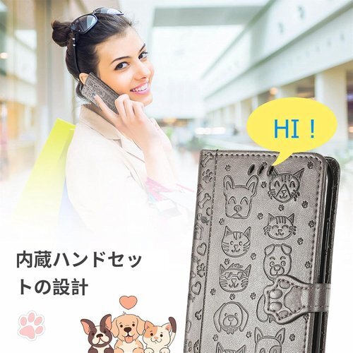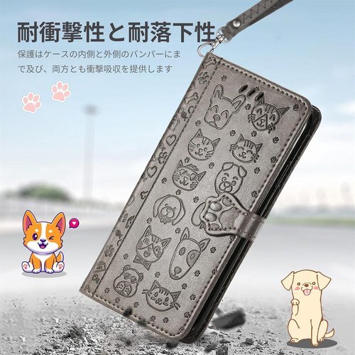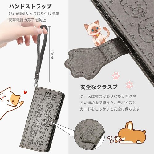 DASFOND いphone14 ケース手帳型 iPhone13 ケース 財布型 カード収納 スタンド機能 高級PUレザー 傷防止 耐衝撃 全面保護 ショルダーストラップ付き マグネットクラスプ 可愛い犬猫パターン スマホケースiPhone 14/13 カバー 6.1インチ グレー 964
