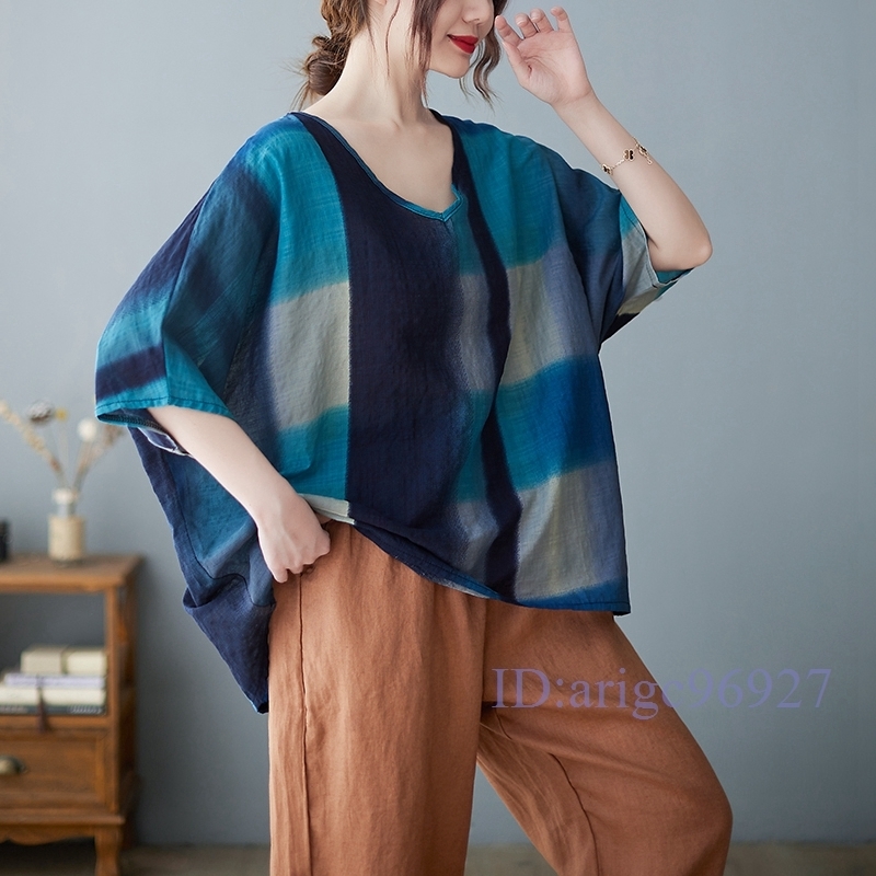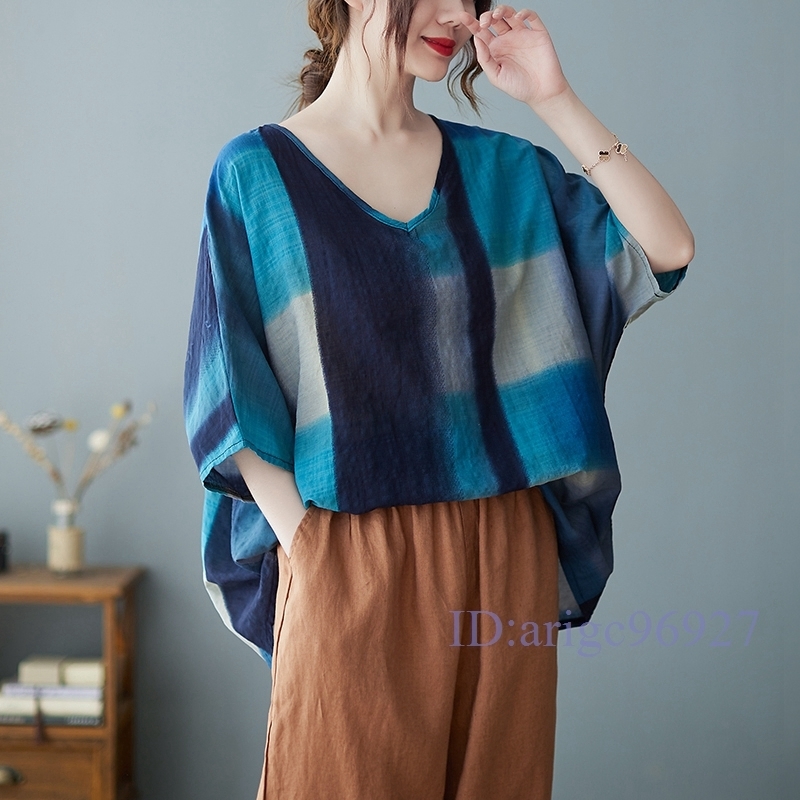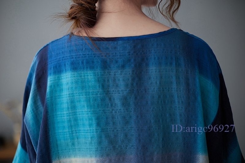 N385★新品春夏***レディース*カジュアル**プリント柄*体型カバー*ゆったり大きいサイズシャツブラウス*ブルー