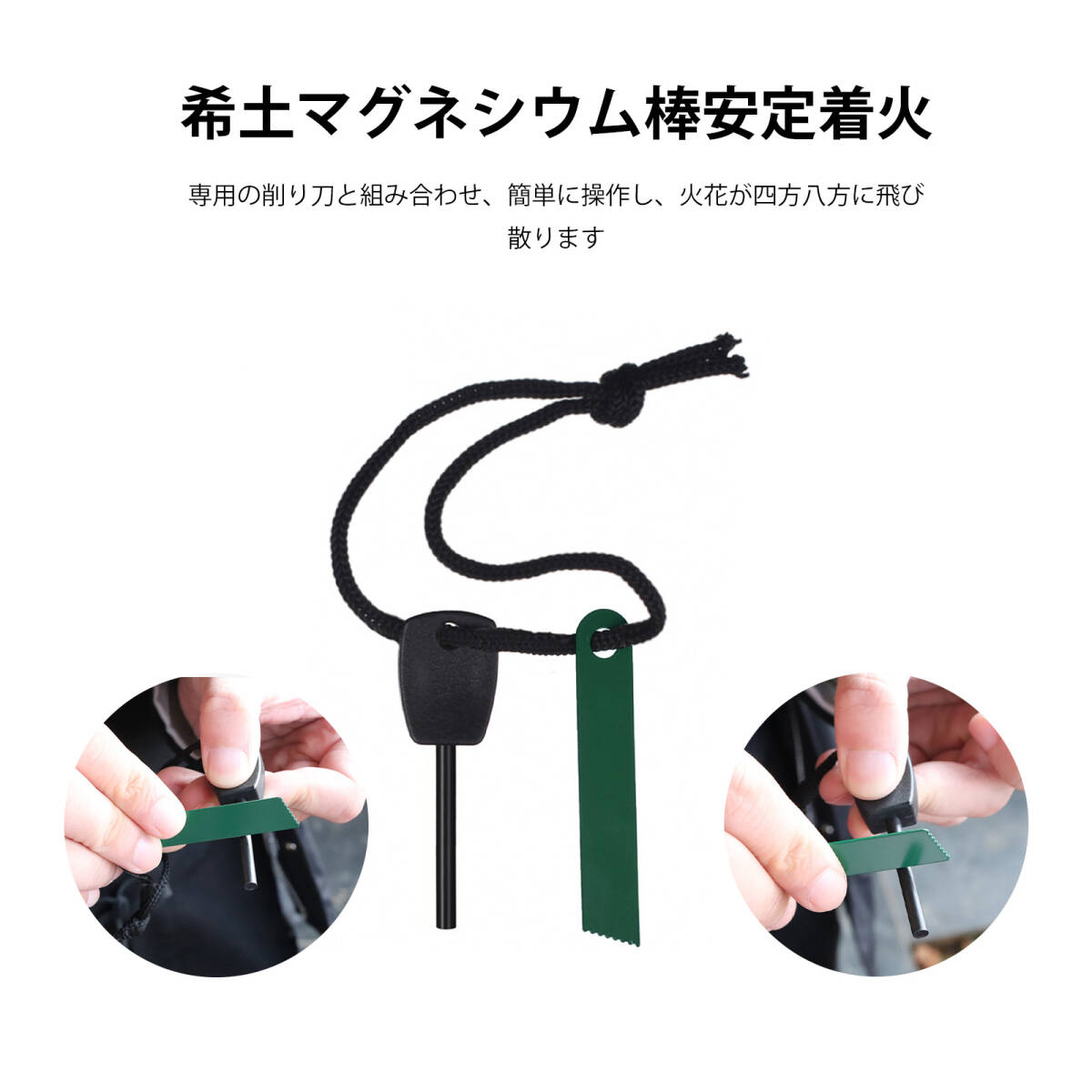 | 製品について | 1.【軽量で携帯性が高い】小さくて軽量で、場所を取らず、持ち運びが簡単です。 2.【耐久性に優れる】高品質の材料を使用し、耐高温で耐摩耗性があります。 3.【多様なシーンで活躍】アウトドアキャンプ、荒れ地でのサバイバルなど、さまざまなシーンで使用できます。 4.【簡単に使用できる】高強度の点火こする刃で、硬度が高く、点火が簡単です。 5.【持ちやすい】人間工学に基づいた設計で、手にフィットし、握りやすくなって います。 |