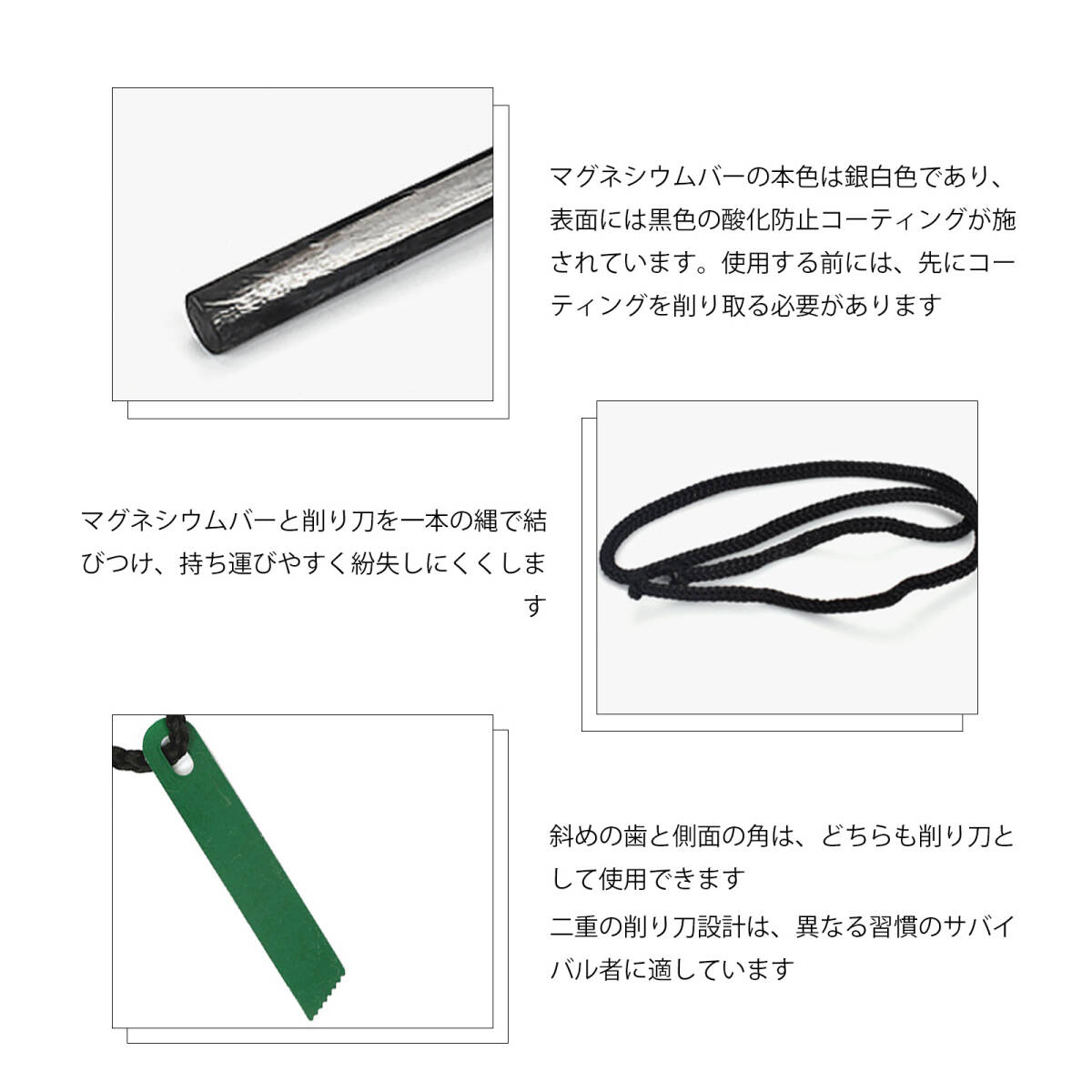 | パッケージ内容 | マグネシウムバー×1、こする刃×1、ロープ×1 |