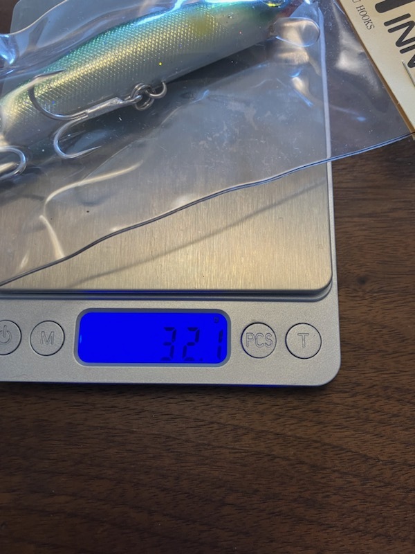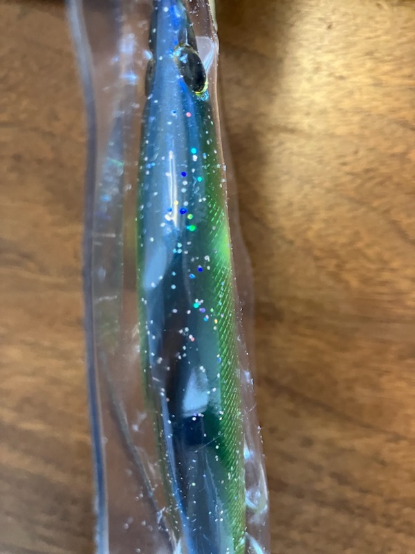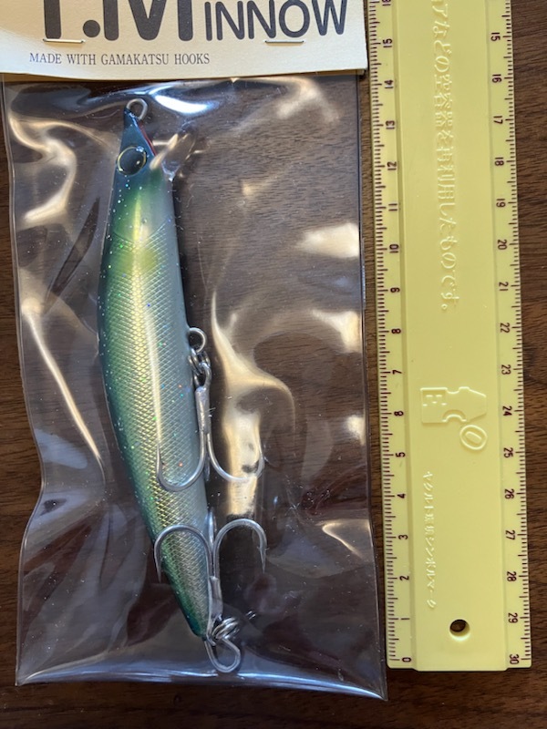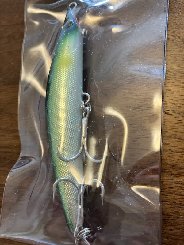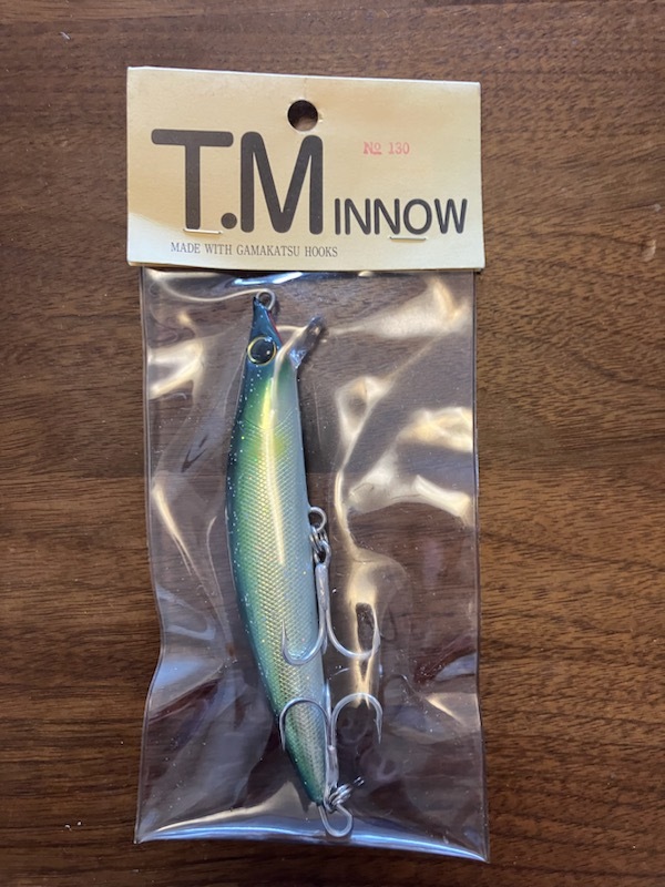 GL工房のツルミノー130、実寸はアイの外々で140mm程、パッケージ込みでの実測重量32.1g(おそらく本体は27g近辺なのでスローシンキング)カラーは画像の通りシルバー系の下地に、ラメ入りのグリーンバックで鮎風にも見えるカラーです。