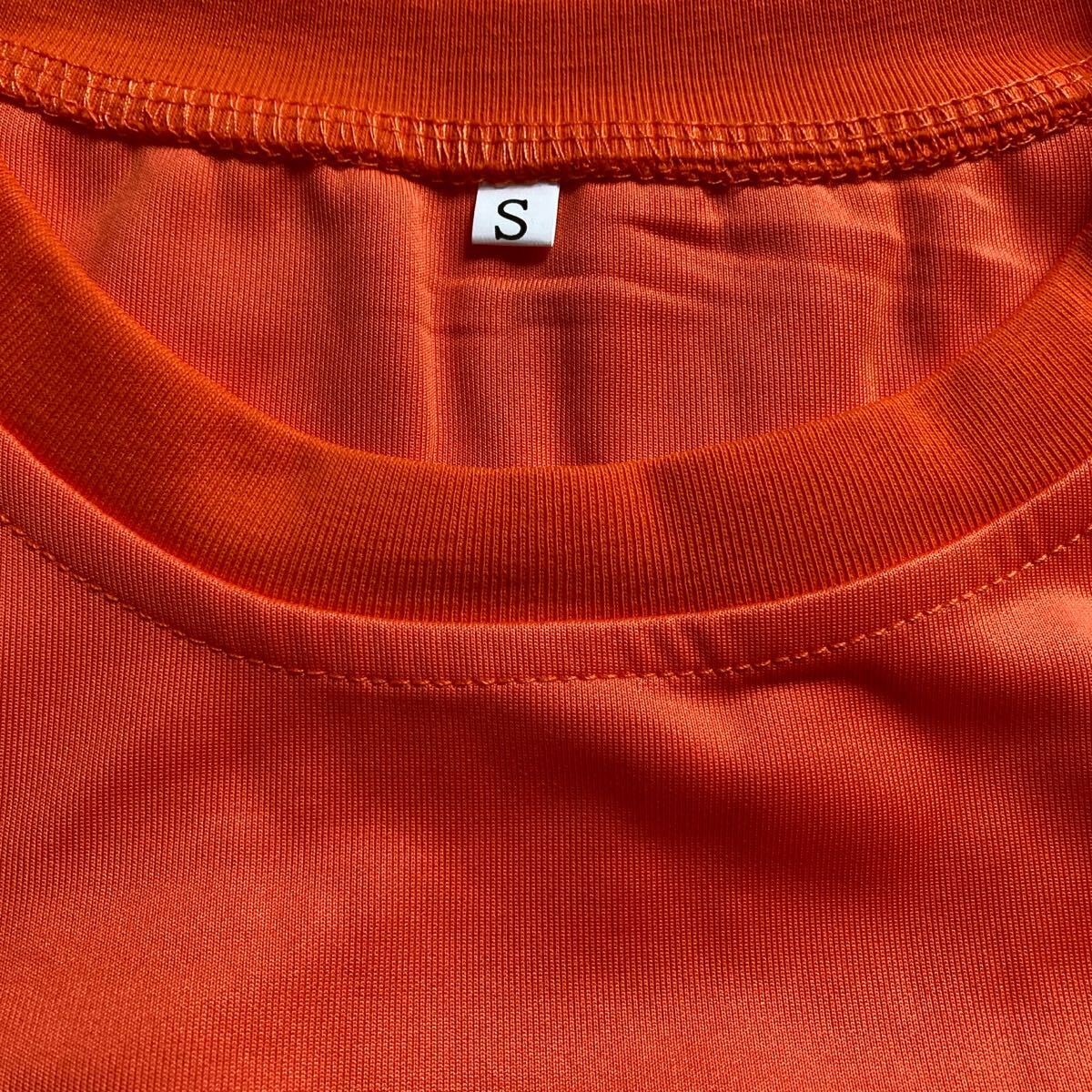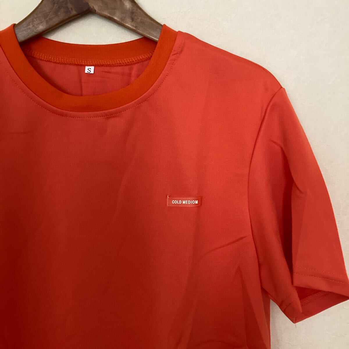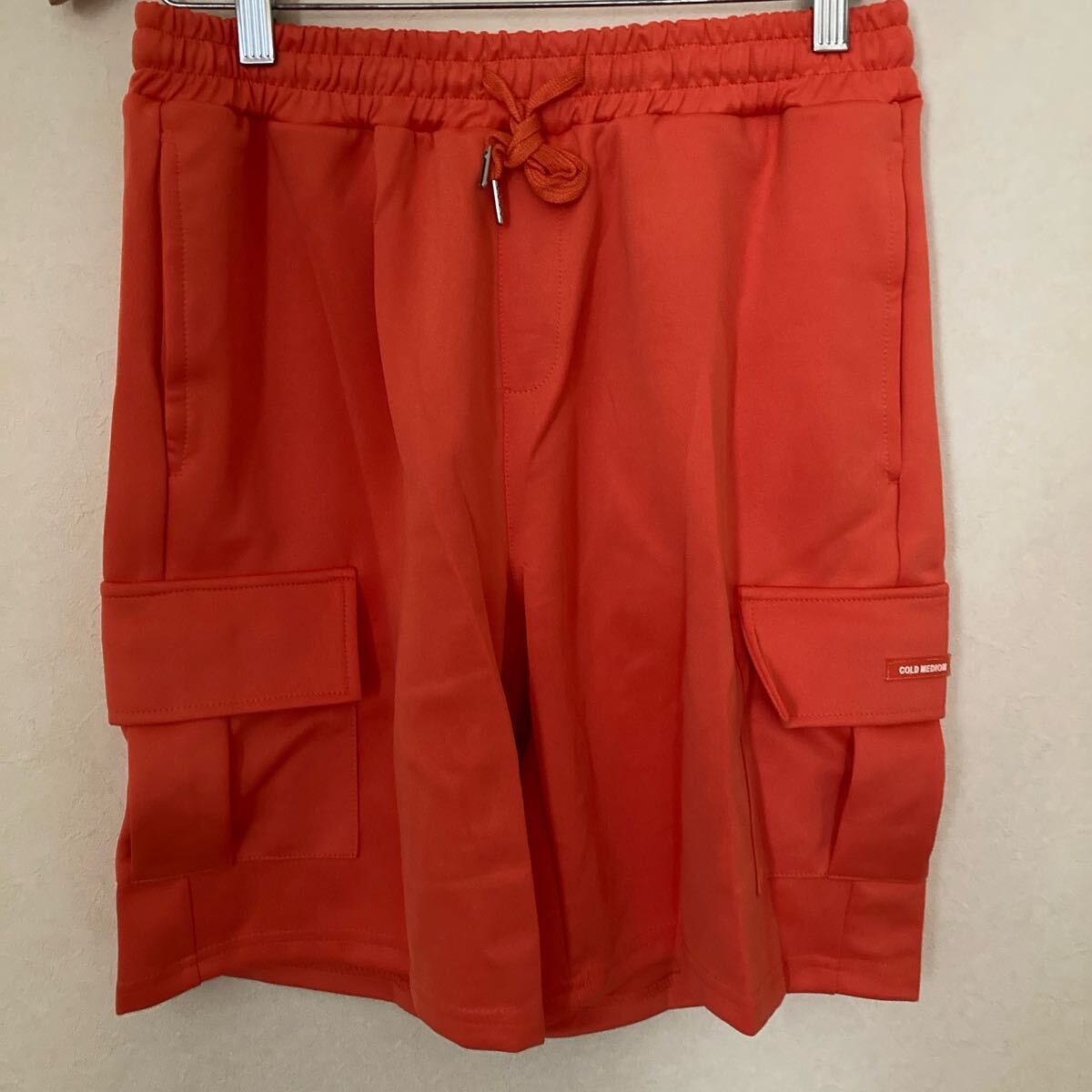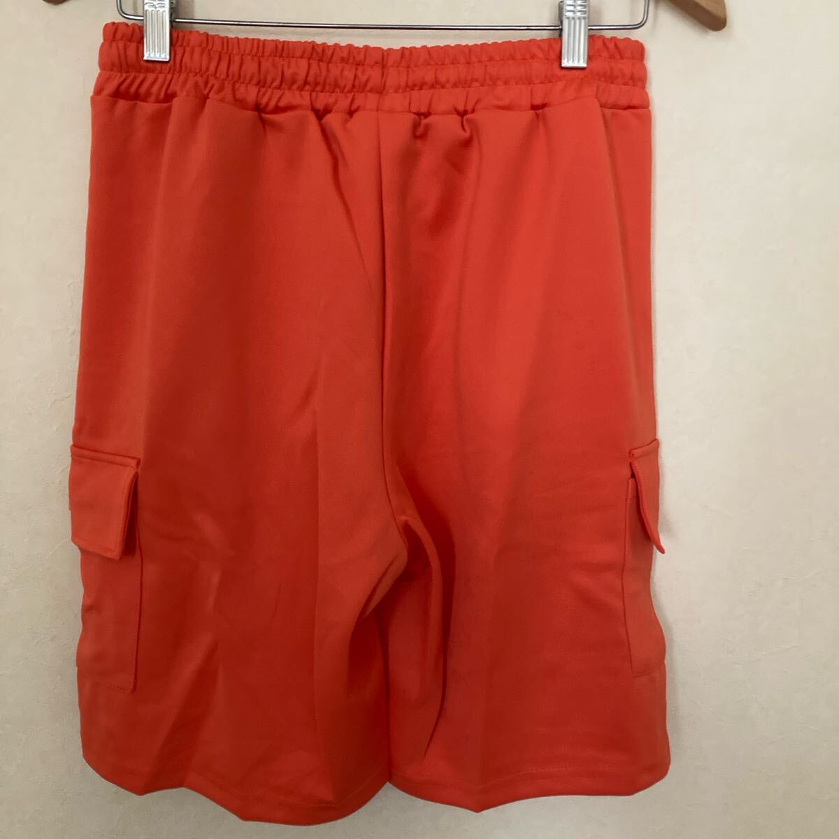 メンズセットアップ、Tシャツとショートパンツの2点セットです。鮮やかなオレンジカラーが特徴で、春夏にぴったりのアイテムです。カジュアルなデザインで、普段使いやスポーツ、アウトドアにもおすすめです。