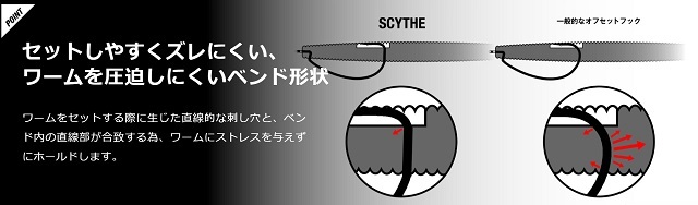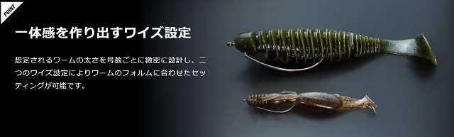 | 新品になります。 セットしやすくズレにくい、 ワームを圧迫しにくいベンド形状 ワームをセットする際に生じた直線的な刺し穴と、ベンド内の直線部が合致する為、ワームにストレスを与えずにホールドします。 | |