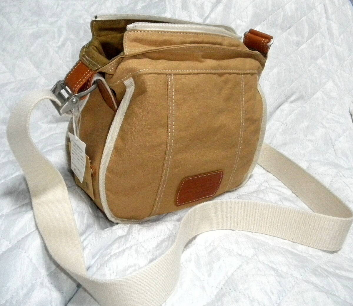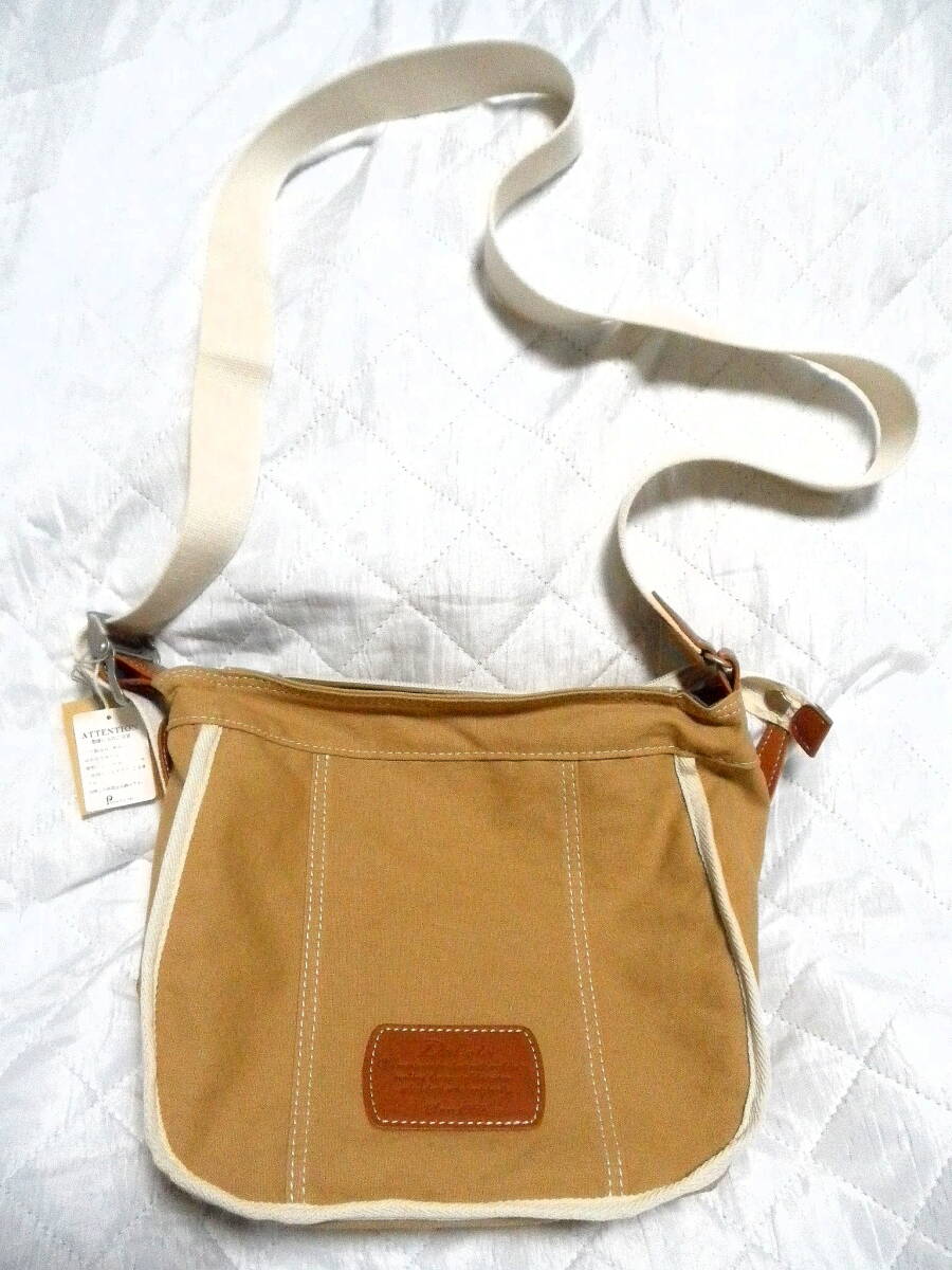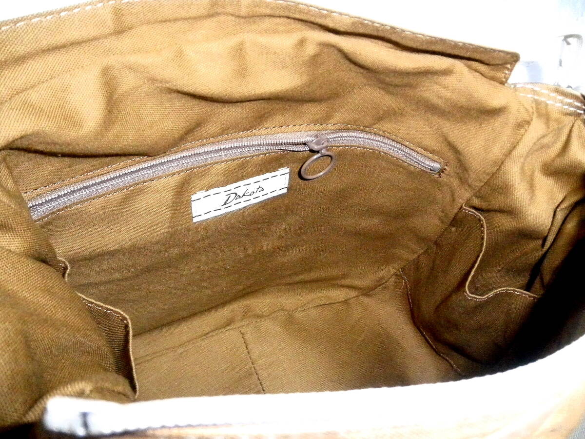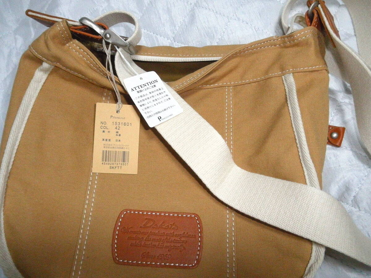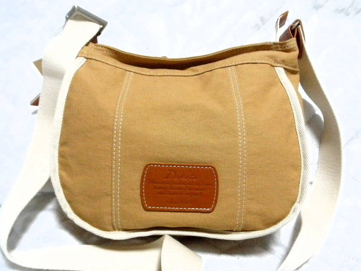 即決 新品 Dakota 日本製 ダコタ ショルダー バッグ ハンドバッグ キャメル ブラウン レザーワッペン 斜めがけ 牛革 コットン 未使用