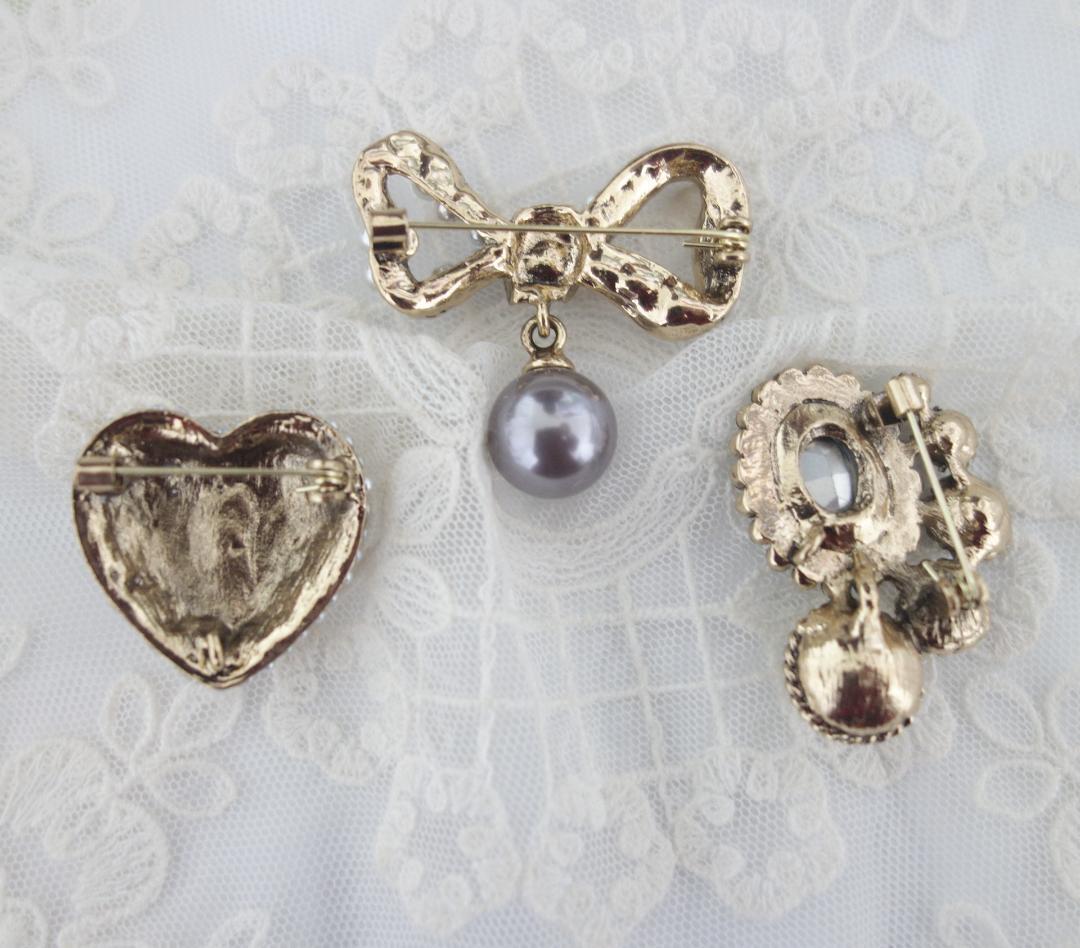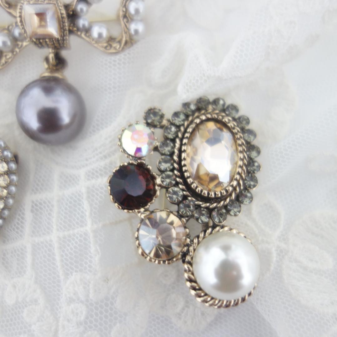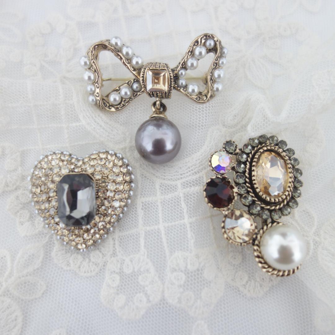 ★当方はオリジナル画像、オリジナル商品名、オリジナル商品説明であり、コピー転載を禁止しております。 アンティーク調のフォルムの雰囲気のある素敵なブローチです。 3個セットです♪ やや小ぶりサイズが可愛いです♪ 1つ1つ楽しめる贅沢な3点セットになります♪ 煌めきの綺麗なシトリン色、シャンパン色、オーロラ色のラインストーン、 イミテーショングレーパールなどシックな優しい色合いが ハートやリボンという甘めのモチーフを大人っぽい可愛さに仕上げています♪ シックな可愛さは希少ですね♪~同梱について~お取り置き、同梱はヤフーのシステムの【まとめて取引】を利用できる条件内で承ります。◆【まとめて取引】を利用できる条件は以下の通りです。必ずご確認ください◆*最初の落札から72時間以内に落札した★取引開始前の商品★(取引情報を開示するとまとめて取引できなくなります。その場合には1点ずつのお取引、送料になりますので、お気を付けください)*依頼する商品を含め20件まで。*落札者の評価が6以上などになります。