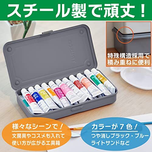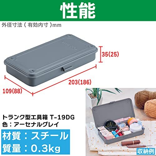 「TRUSCO(トラスコ) トランク型工具箱 203X109X35 アーセナルグレイ T-19DG」▼4989999610475▼(商品説明)・アーセナルグレー ハーフL T-19DG・・Color:アーセナルグレーSize:ハーフLPatternName:長編開閉・色:アーセナルグレイ、有効内寸(mm)間口:186・有効内寸(mm)奥行:88、有効内寸(mm)高さ:25・南京錠(別売):取付不可、フック:なし・横滑り防止溝:あり、シリンダ錠(別売)・中皿なし、本体:スチール