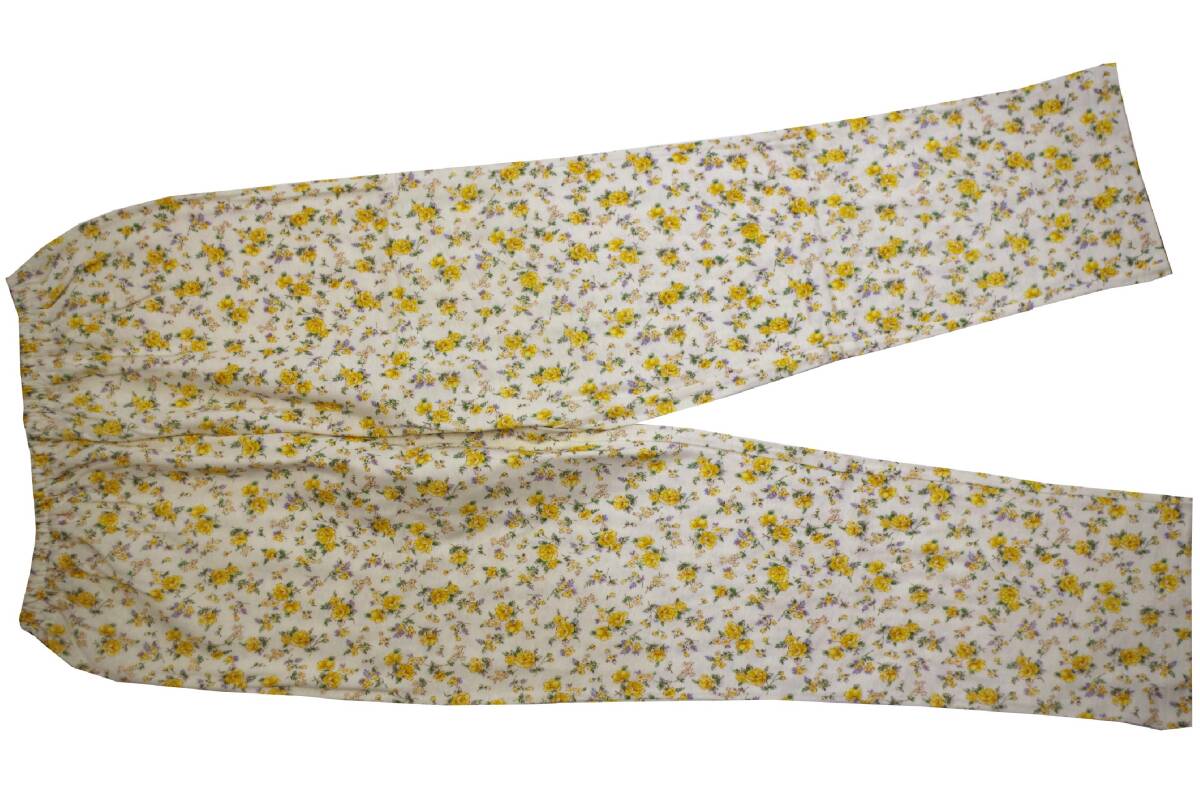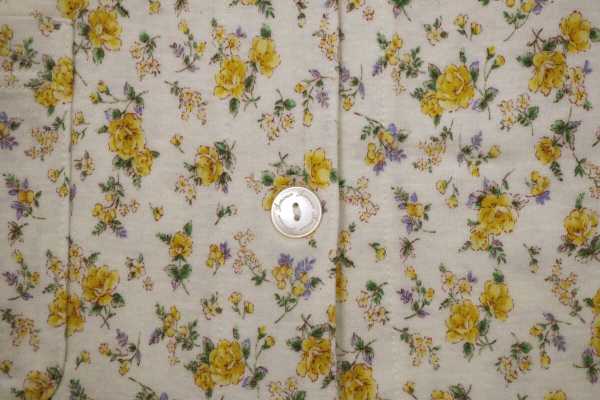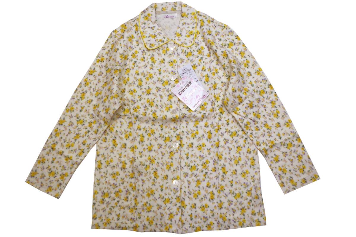 サイズはM。前開き、長袖、ロングパンツ。パッチポケット付き。バスト79-87㎝。色はイエロー。素材は綿100%の接結ニットふんわりと柔らかい肌ざわり。日本製です。