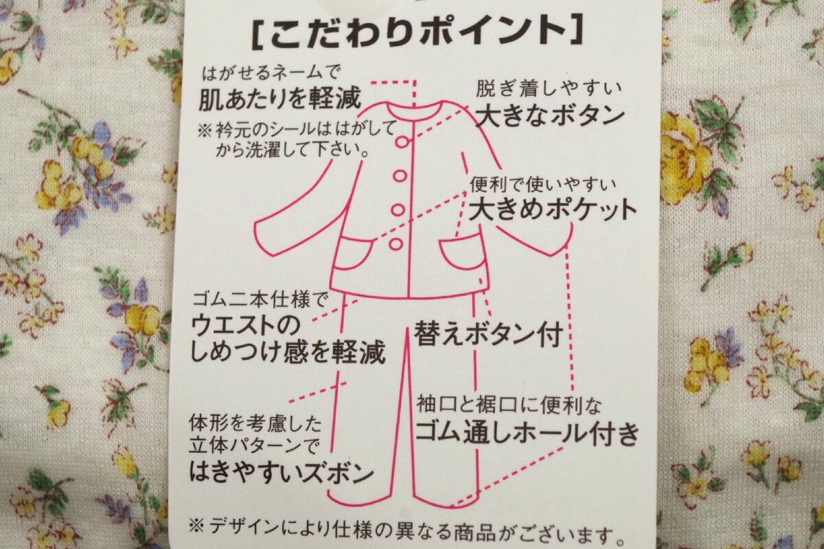 脱ぎきしやすい大きなボタン。使いやすい大き目ポケット。二本仕様のゴムでウエストの締め付け感を軽減。袖口と裾口にゴム通しホール付きなど。詳細は写真をご覧ください。