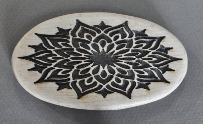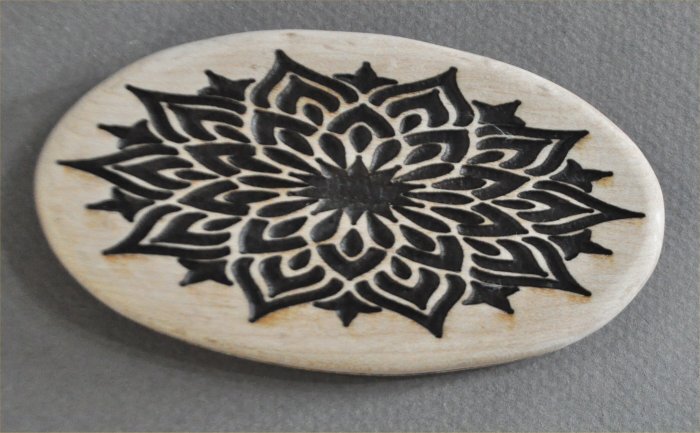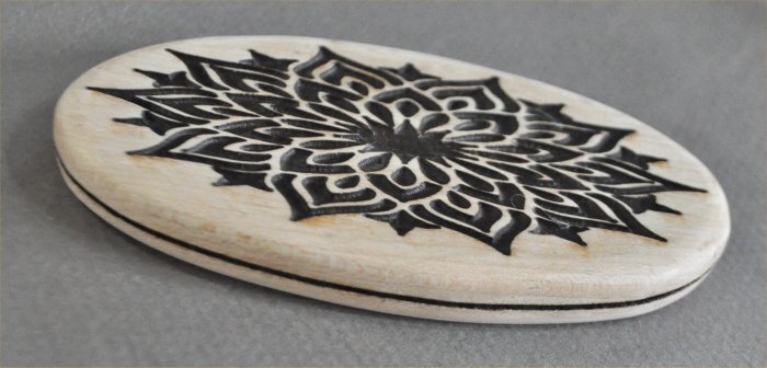 メイプルのレーザー彫の飾り模様のオーバルベースサイズは、102mm×57mm厚み10mmバーズアイメイプルなのですが、淵周りに少しだけ見られます。豪華な花幾何学模様のレーザー彫のオーバルベースです。