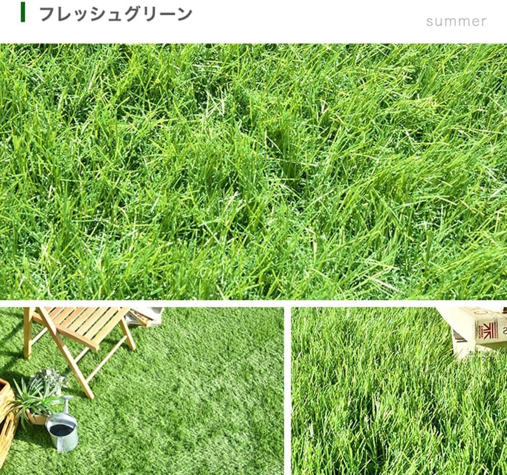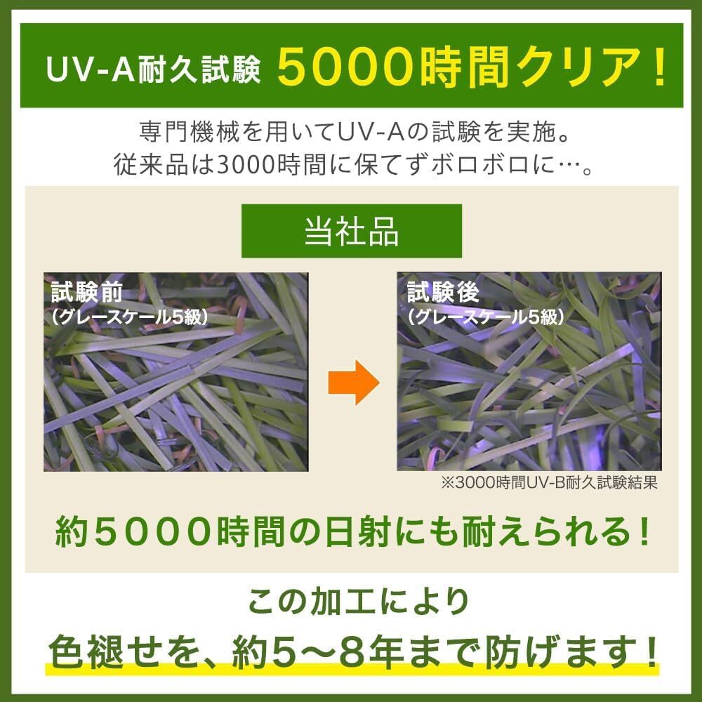 【備考】※生産時期によりわずかに色味に差異がございます。そのため並べてご使用される場合は一度に必要分をご購入いただくようオススメしております。 ※追加購入をご検討のお客様で、以前ご購入いただいたものがご不明な場合はお気軽にお問い合わせください。※生産時、大きめにカットしているため、奥行に最大10cm程度のばらつきがある場合がございます。 ※コンクリートに設置する場合は、専用の両面テープや接着剤での固定を行ってください。 ※2022年10月12日に密度と厚みを増やし、葉形を変えてより耐久性のある人工芝にリニューアルしました。