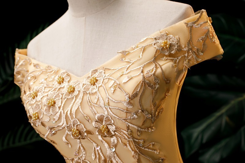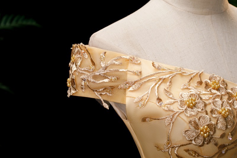 サイズオーダー無料♪ゴールド♪オフショルダー★二次会★演奏会★発表会★プリンセスライン★パニエ&アクセサリー小物付属★前撮り★