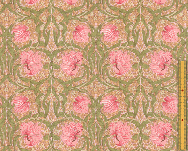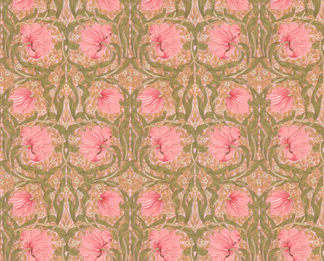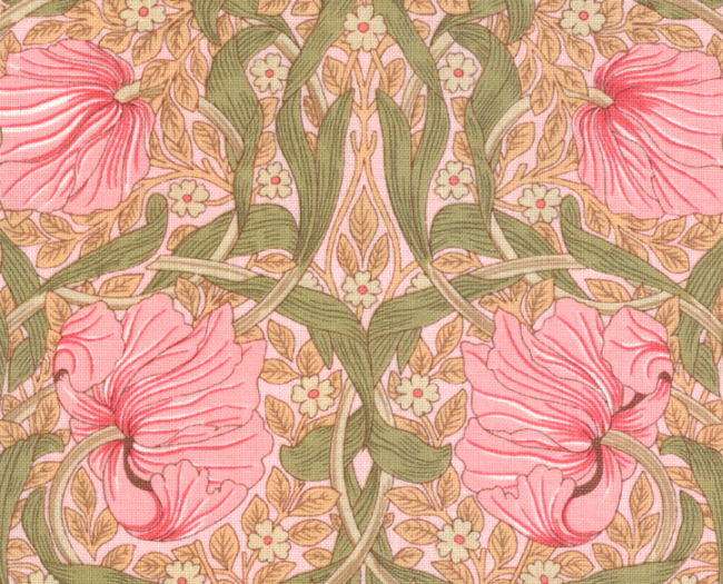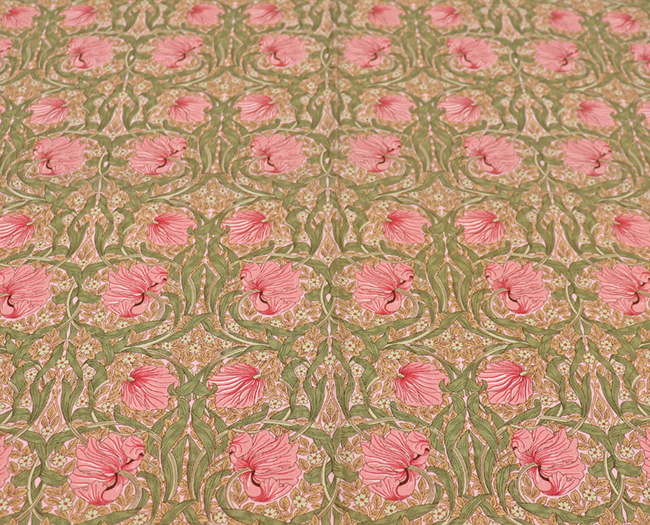 「ピンパネル(Pimpernel )」は、1876年にウィリアムモリスが壁紙としてデザインした作品で、鏡面対象に描かれた、荒涼としたイメージの風に吹かれた花のパターンは、ウィリアム・モリスの素晴らしデザインの典型です。ハマー・スミス、ケルムスコット・マナーのダイニングルームに使われていたことから、モリスお気に入りのデザインだったと推測されます。