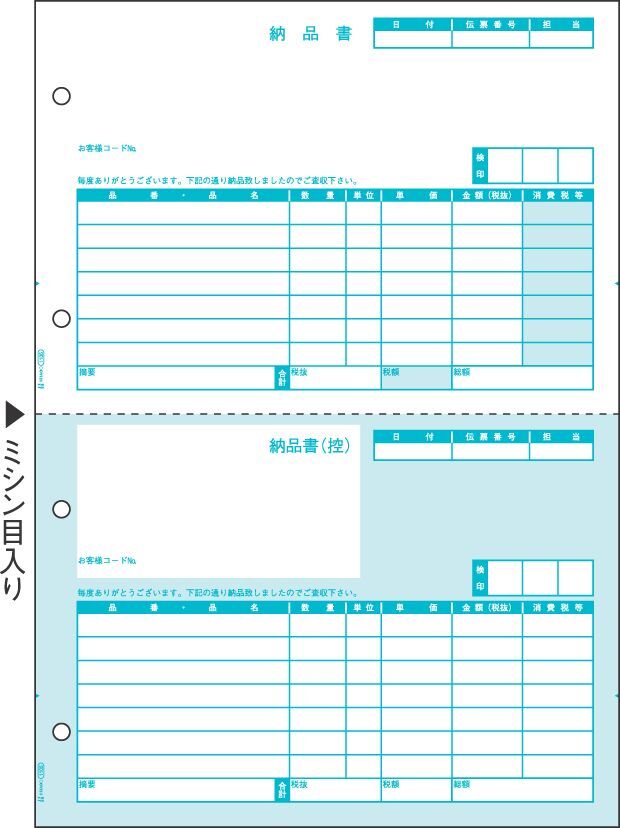 レーザープリンタ用帳票。A4サイズ2分割(納品書/納品書(控))1箱500枚入り。ミシン目切り離し後のサイズ;148.5x210mm。ファイル穴2穴。ファイル穴間隔:80mm。紙厚:0.08mm坪量;64g/m2。