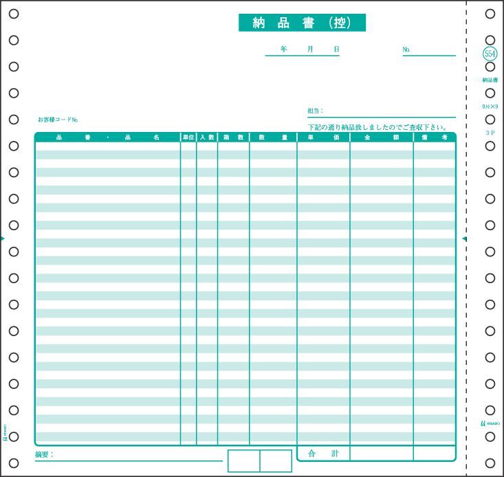 ドットプリンタ帳票。3枚複写。納品書(控)/請求書/納品書。紙色:白/クリーム/白。刷色:青緑。サイズ:9_1/4x9"。ミシン目切り離し後の横幅:8_8/10"。右ミシン。