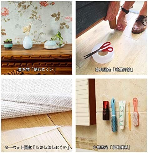 • 【水で繰り返し&多機能で活躍】更にこのテープは水で粘着性を回復できます!水で粉塵などを洗い落とし、テープを干してから、またもとのテープに戻れます。色んなシーンで大活躍します。日常の家の玄関や台所、客室、洗面所から、オフィス、寮、家電製品の足固定「地震対策」、コマーシャル看板の固定、カーペットの滑り止め、小物収納や置物固定などにご利用いただけます。テープの取るコツ:貼った後のテープの隙間に少し水を入れさせたら、自然に取れやすくなれます。原理:テープの粘着面が水分と接触すると、粘着性がしばらく減ります。取ってから干して水がなくなるまで、また粘着性が戻れます。