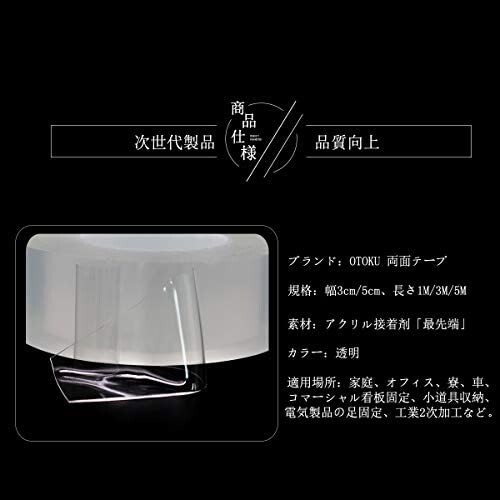 • 【製品仕様】種類:両面テープ。素材:アクリルゴム。色:透明。長さ:1m / 3m / 5m。幅:3cm / 5cm。厚さ:2mm。適用場所:日常家庭用、オフィス、寮、家電製品の足固定「地震対策」、コマーシャル看板の固定、カーペットの滑り止め、小物収納や置物固定などです。パッケージ:魔法両面テープx1。