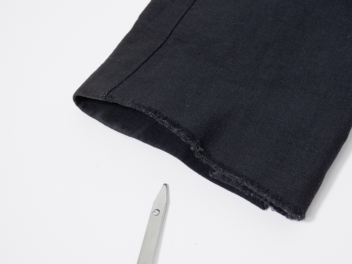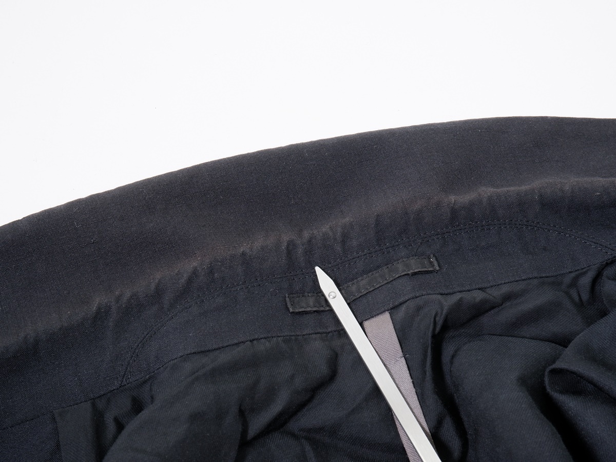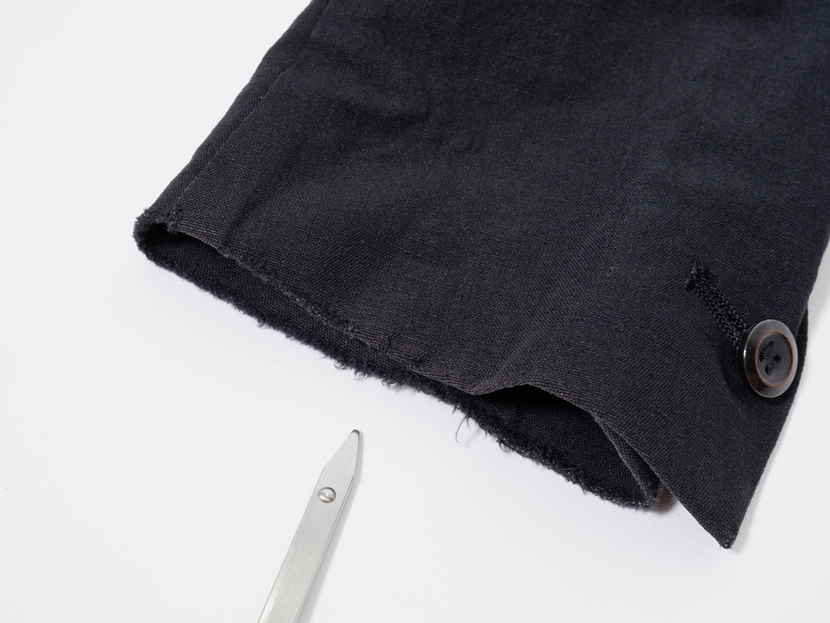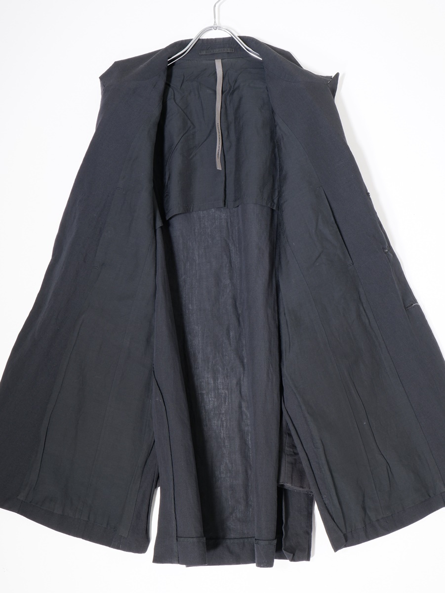 【素材感】ややハリ感のある柔らかな生地 【透け感】なし 【裏地】あり(背抜き) 【ストレッチ】なし 【開閉デザイン】ボタン 【付属品(取り外し可)】なし 【商品情報】Z撚りウールリネン(TOP糸)を交織させ織りあげたトロピカル地を使用。ピークドラペルを配したロング丈のジャケットは深めのスリットにAラインを採用。参考定価63720円。 |