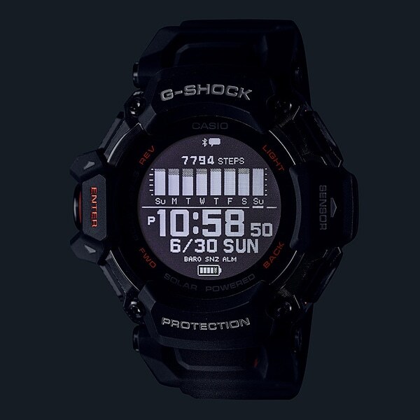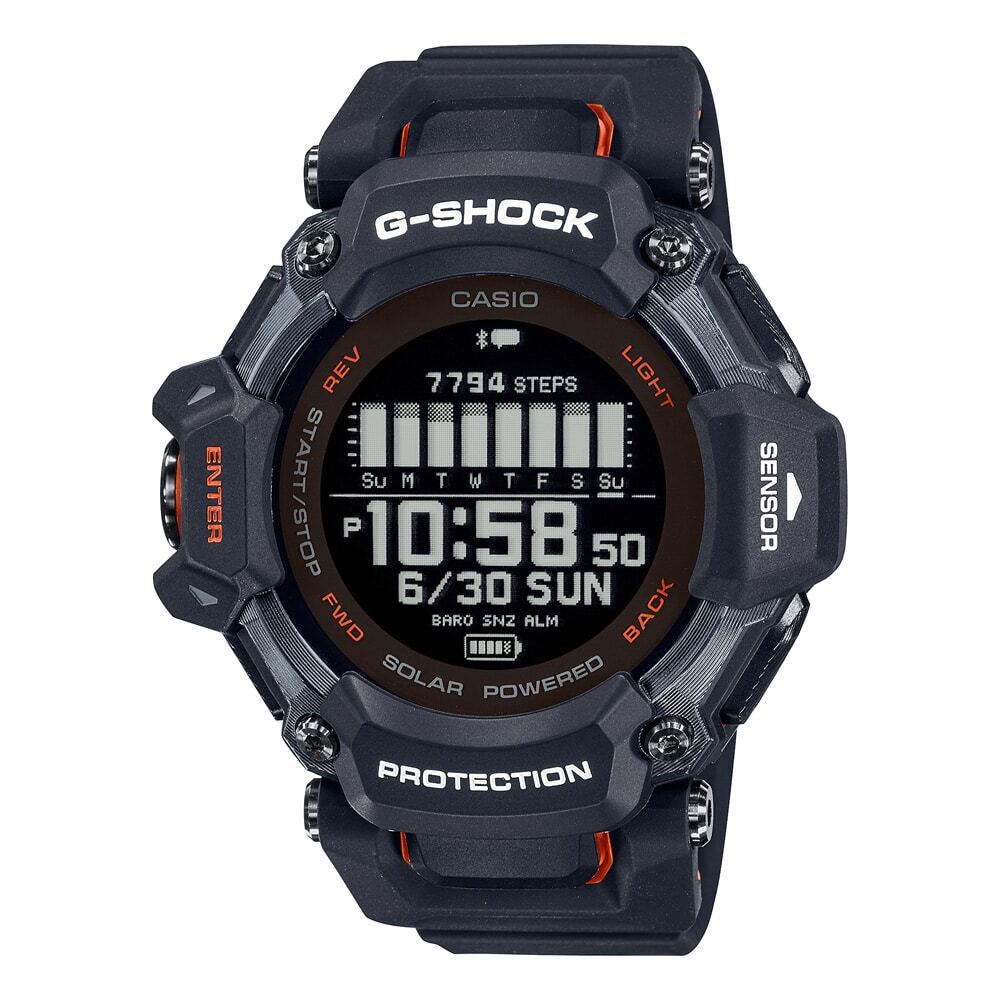 ☆★カシオ G-SHOCK【G-SQUAD】ソーラー充電 USB充電 GBD-H2000-1AJR☆★G-SHOCKのスポーツライン「G-SQUAD」に心拍計とGPS機能を搭載したGBD-H2000シリーズです。距離・速度・ペースなどの計測に加え、心拍計測が可能な光学式センサー、歩数計測が可能な加速度センサー、水泳時の泳法やターン判定などを行うジャイロセンサーと方位、高度/気圧、温度センサーを搭載。ランニングだけでなく、自転車、水泳等のマルチスポーツに対応しています。また、トレーニング解析・睡眠による回復度の解析も可能です。ウレタンベゼルとバンドにはバイオマスプラスチックを採用。デザイン面では、手の甲への干渉を軽減する曲面形状の裏蓋、操作性を向上させるテクスチャー入りボタン、視認性の高い高精細MIP液晶を採用。USB充電とソーラー充電にも対応し、実用性も追求しました。◇メーカー希望小売価格60,500円(税込)◇●耐衝撃構造●材質:樹脂●20気圧防水●GPS●ソーラー充電●USB充電●モバイルリンク機能●無機ガラス●ワールドタイム●ムーンデータ●日の出日の入りの時刻●ストップウォッチ●タイマー●時刻アラーム4本/スマートアラーム●LEDバックライト●LED:ホワイト●フルオートカレンダー●操作音ON/OFF切替機能●パワーセービング機能●バッテリーインジケーター表示●機内モード●バイブレーション機能●操作バイブレーションON/OFF切替機能●12/24時間制表示切替●サイズ:59.6×52.6×19.4mm●重さ:63g※新品未使用品※取扱説明書付※メーカー保証書1年付※国内正規品