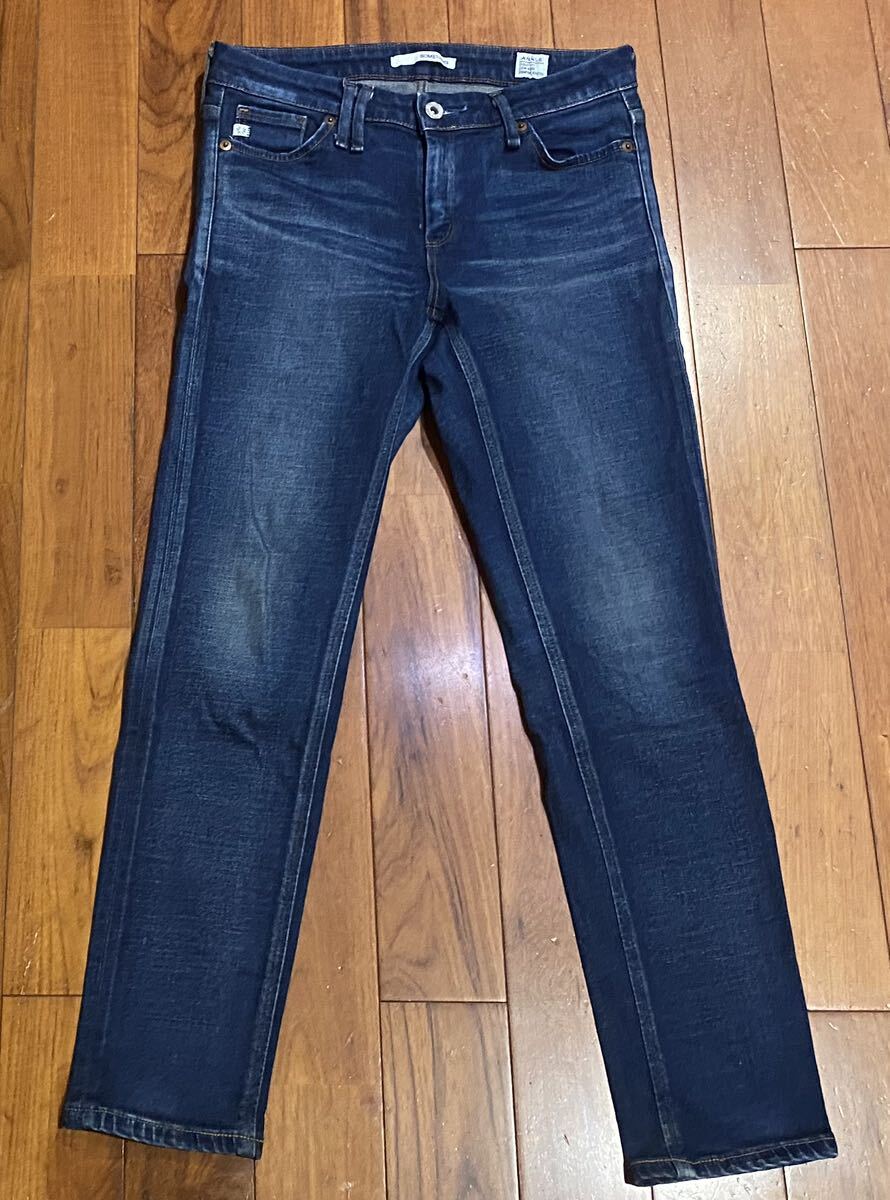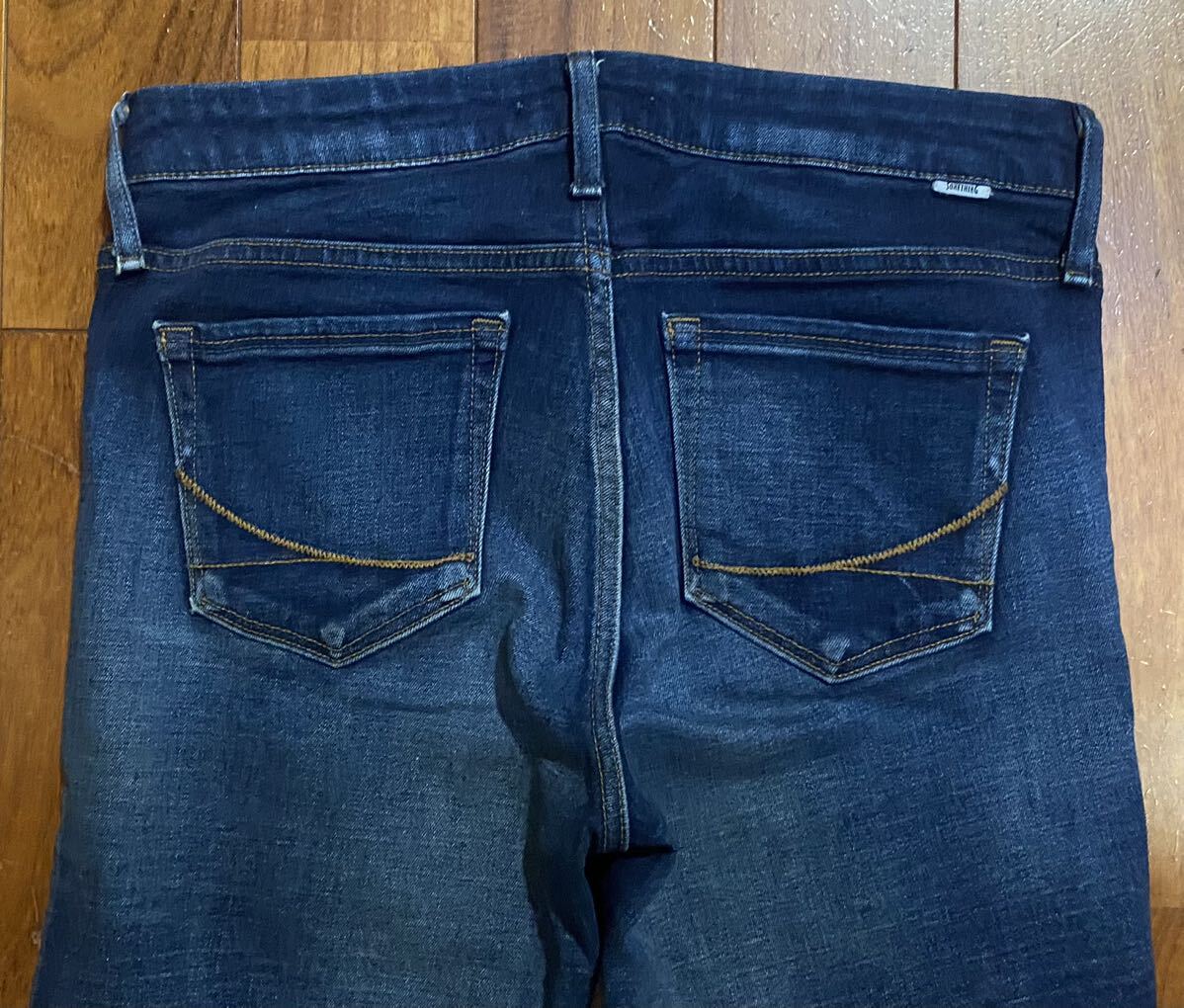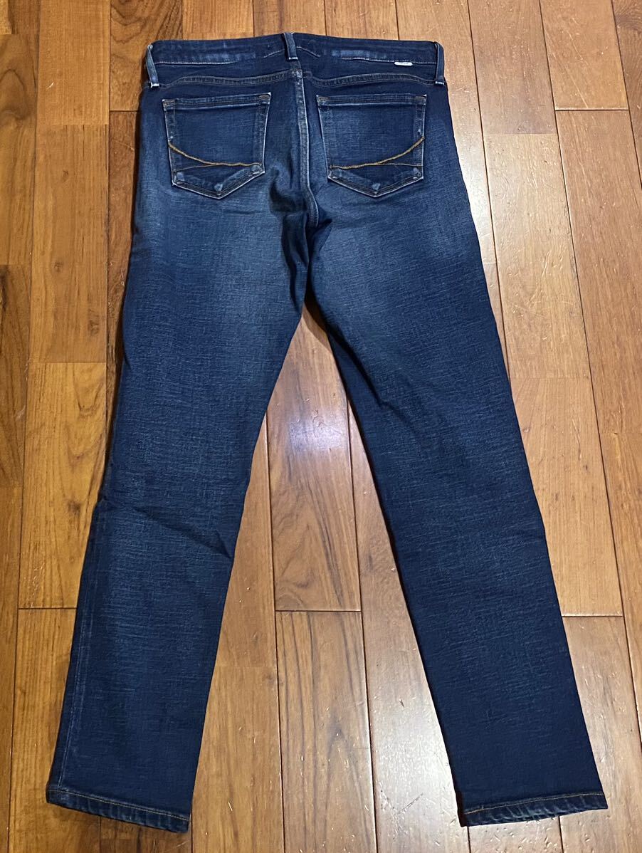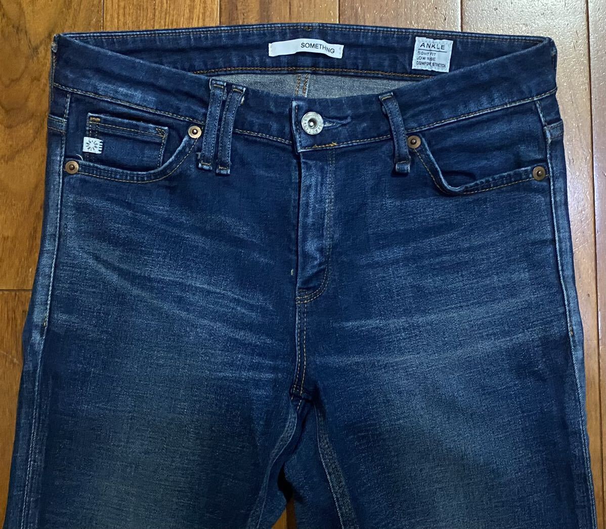 サムシングのストレッチアンクルスキニーデニム(ジーンズ)、ANKLE TIGHT FIT LOW RISE COMFORT STRETCH SEA06 ESV-9507 E502-2904です。色はインディゴブルーです。USEDですが状態は良いです(10段階中8程度)。ジッパーフライ、裾はチェーンステッチです。生地はストレッチ入りで綿99%、ポリウレタン1%です。正規品です((株)エドウィン、日本製)。サイズはMでウエストは重ねずに平置きで約73cm、ヒップ約84cm、股上約22cm、股下約68cm、股下15cmのふともも部分約43cm、裾まわり約29cm、重量約450gです。