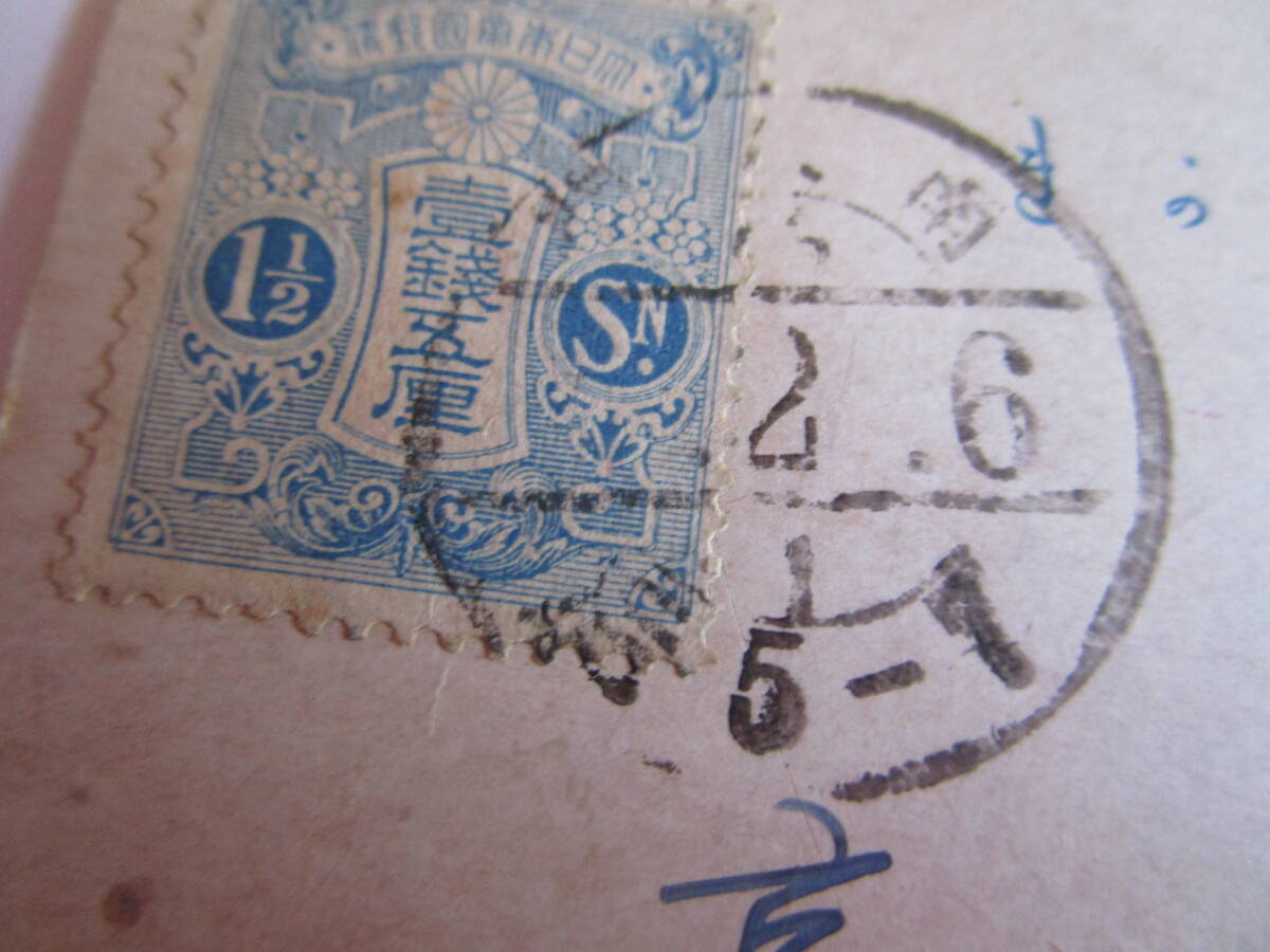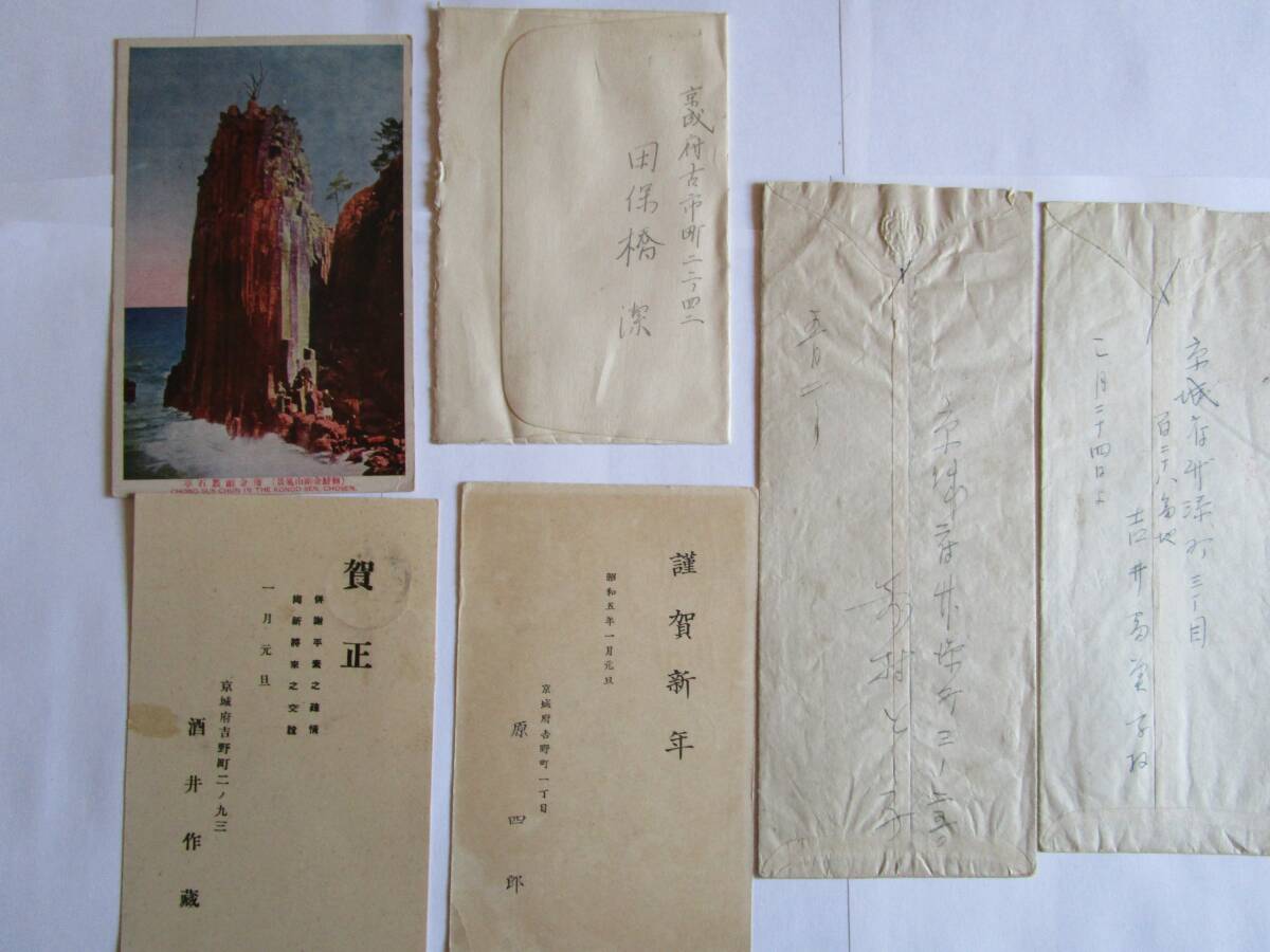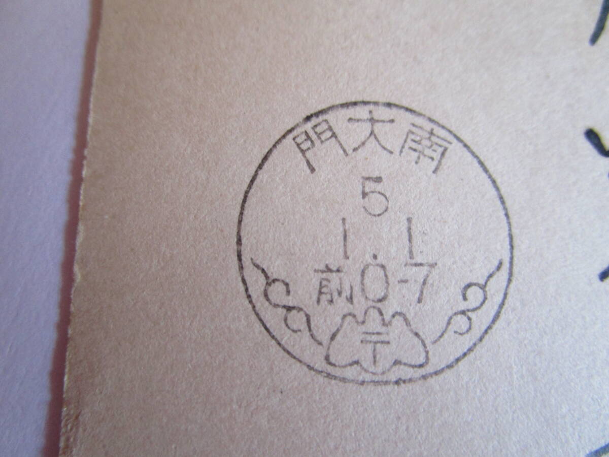1、朝鮮金剛山風景カラー写真葉書の切手面に旧大正毛紙1・5銭貼・櫛型印南大門(局)4・2・6消(画像3参照)→秋田市・本町宛。