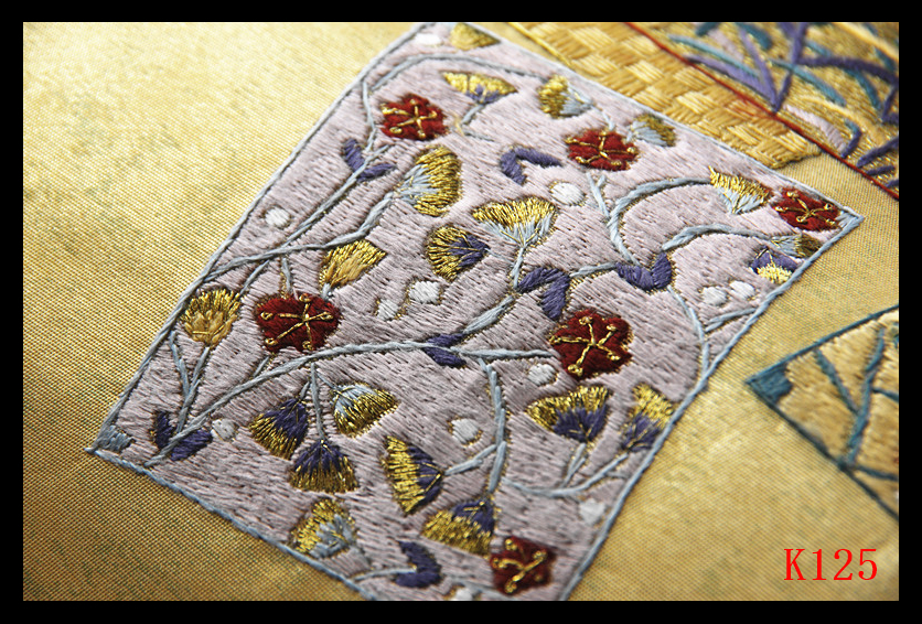 K125厳選西陣 刺繍 色紙草花紋 芥子色地 気品豊かに 高級美術正絹純金箔糸名古屋帯  ◇検◇簪着物袋帯帯締め
