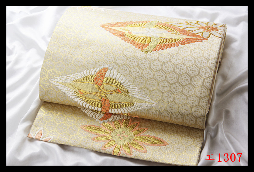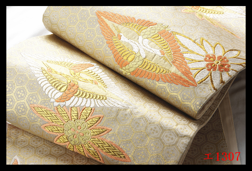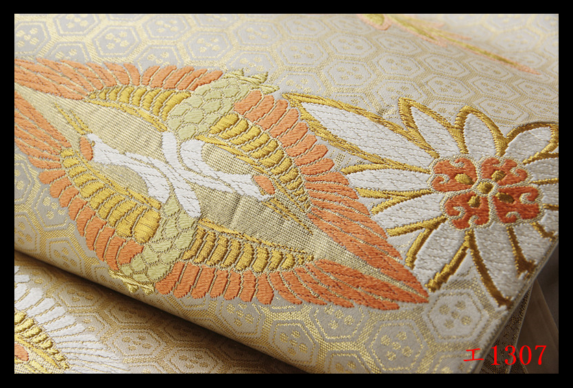 A【エ1307】西陣美品 高砂 振袖可 菱取向鶴紋 気品豊かに 正絹純金糸六通高級美術袋帯 検★着物名古屋帯和装小物帯締め