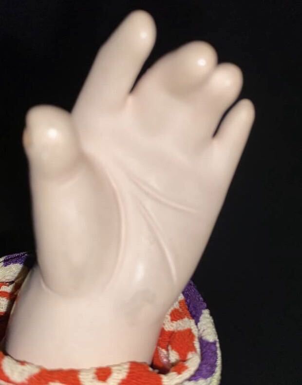 人毛でガラス玉の目、手の甲 手のひらに線が入っています。
