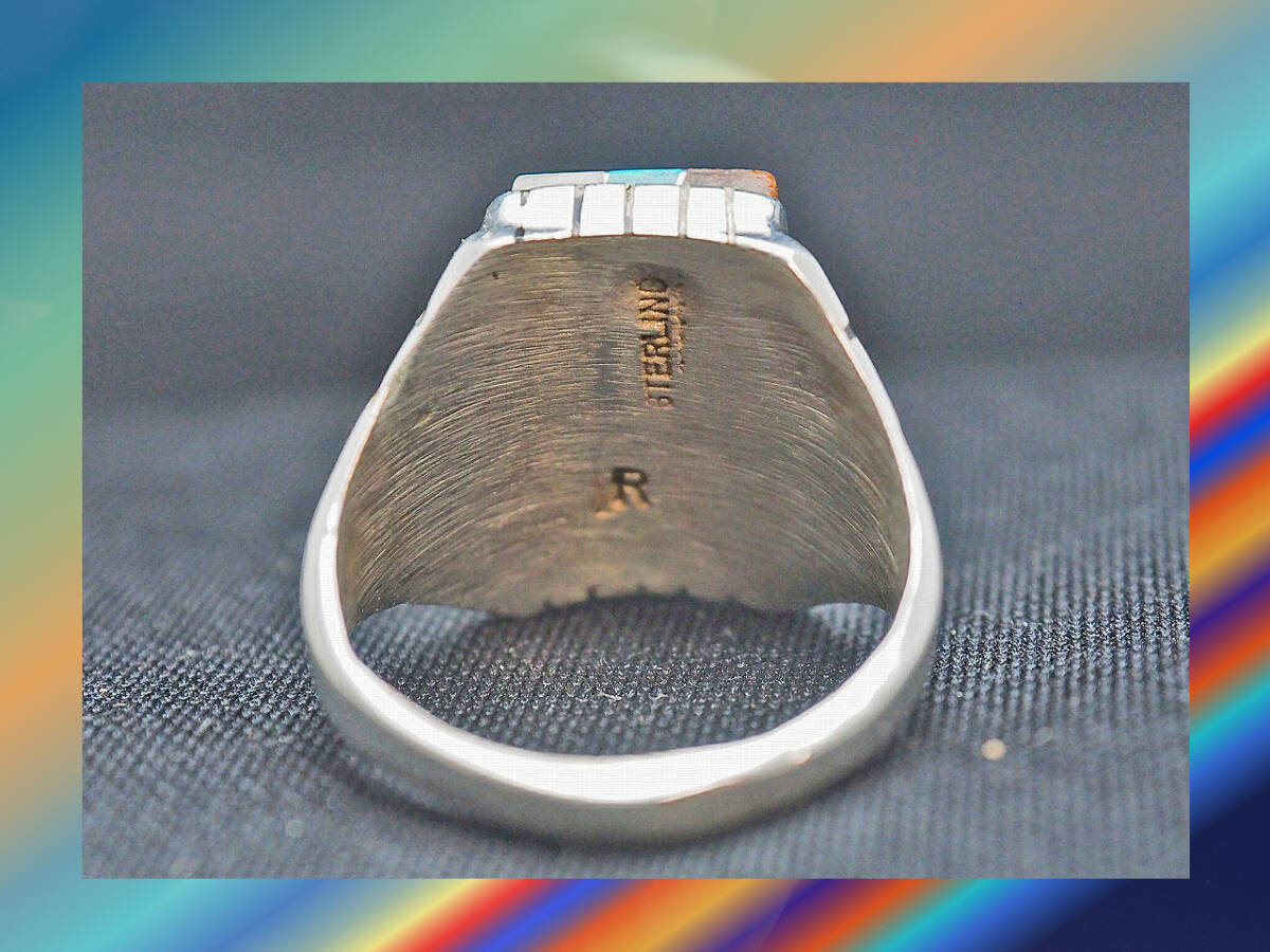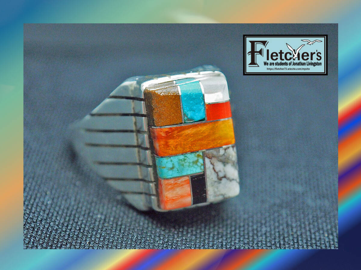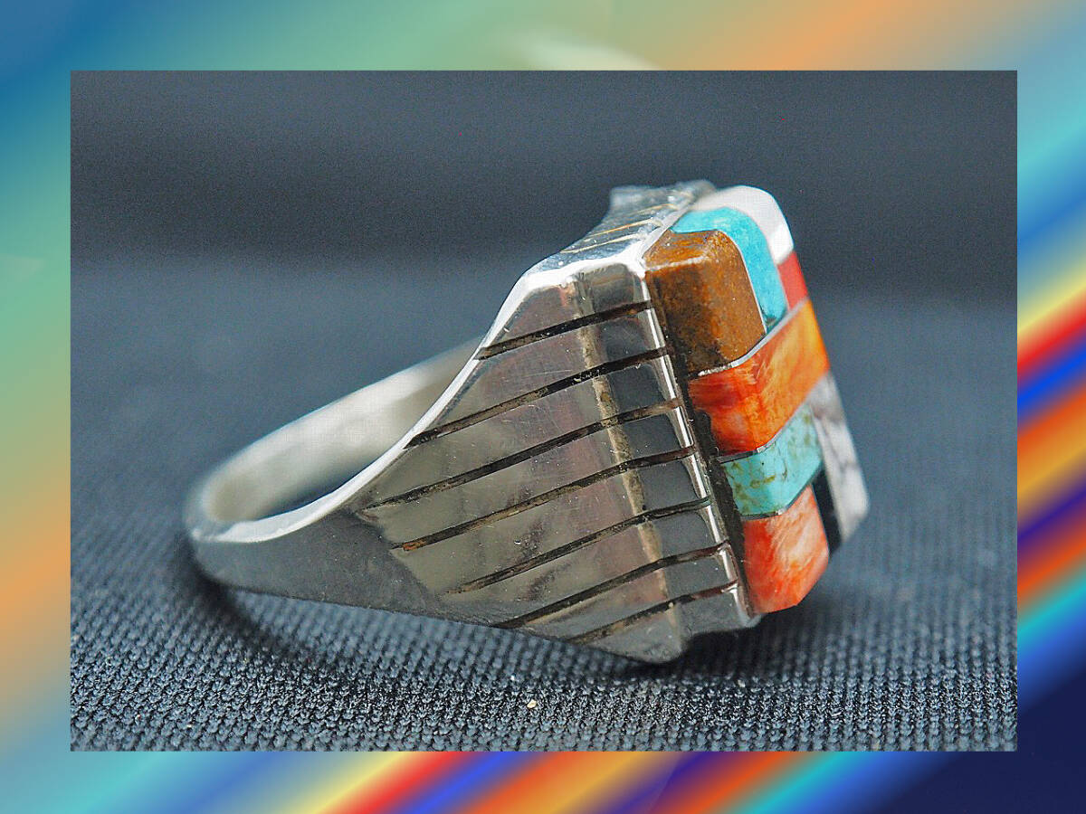 質感のあるシルバーの地金に、細密にカットしたターコイズ、ワイルドホース、スパイニーオイスター、ジェット、マザーオブパール、コーラル、アゲートをモザイク状に組み上げた物を埋め込んだ大変凝ったリングです。